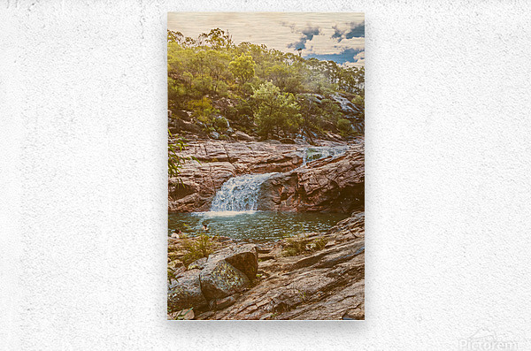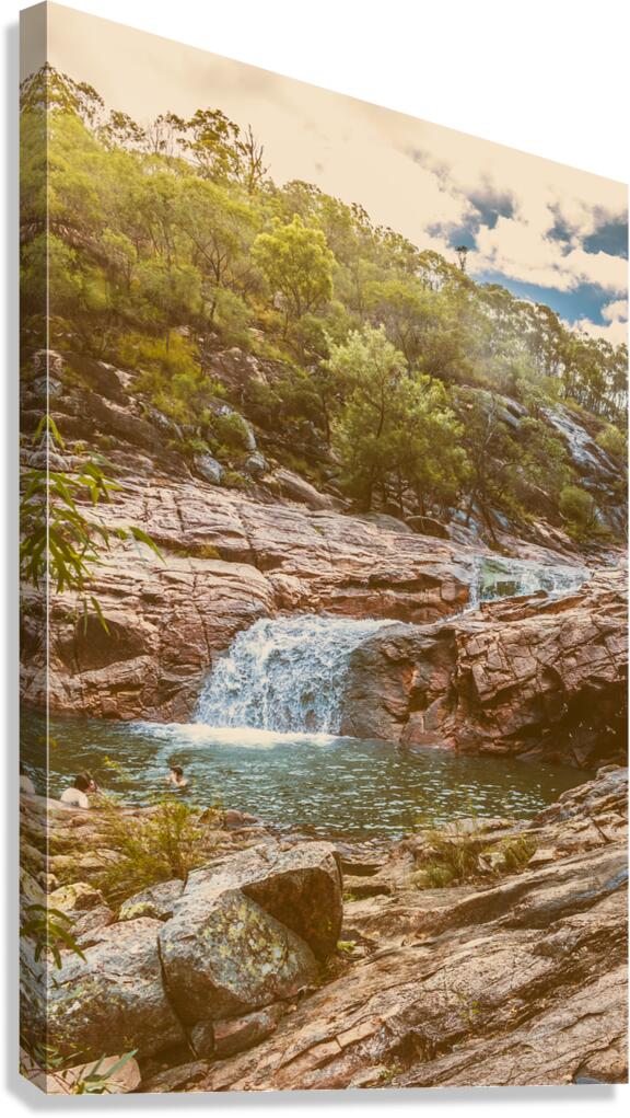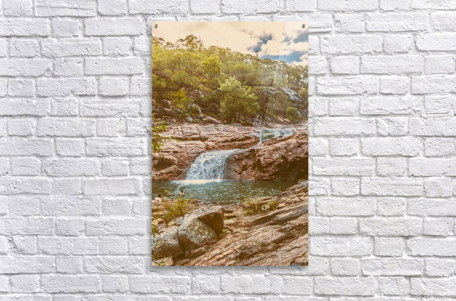 Scene in vertical tranquillity with mountainous falls in bushland oasis. Mt Walsh Waterfall Creek Utopia Falls Biggenden Australia