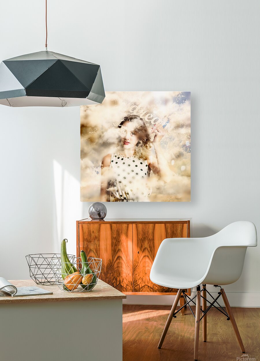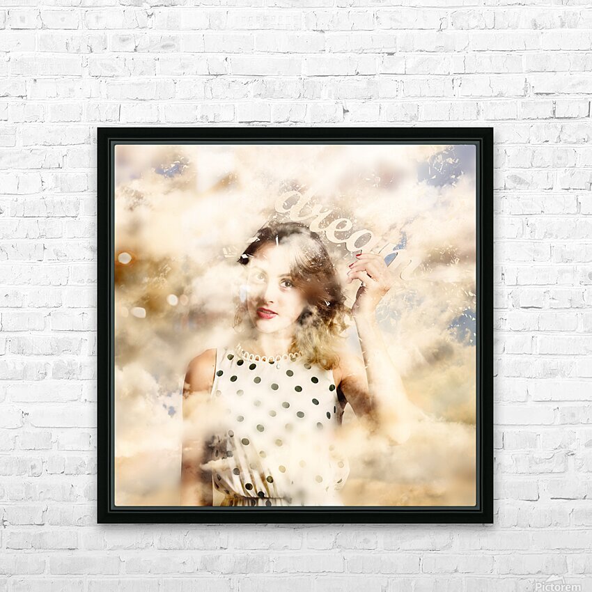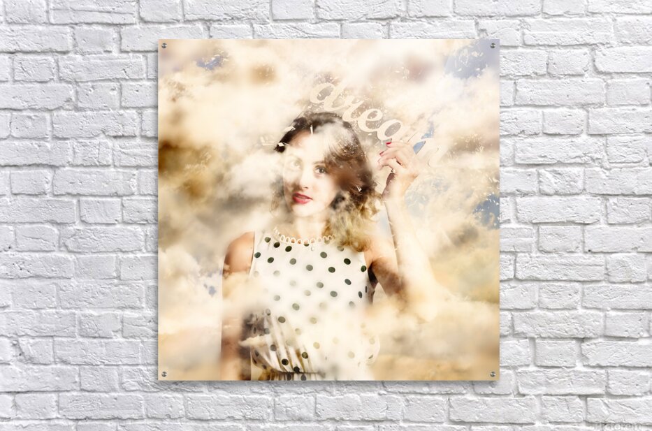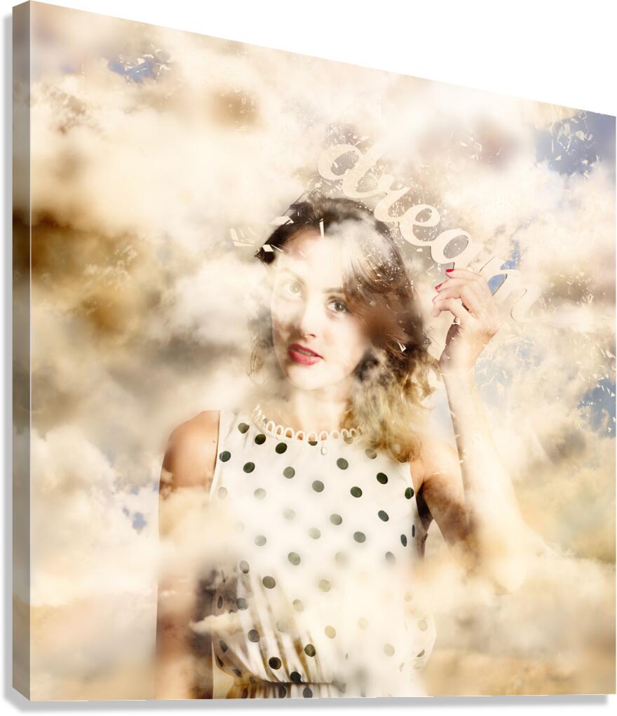 Magical surrealism photograph of a beautiful young girl holding the words DREAM while walking with her head in the clouds. Manifestation in thought dream big to create