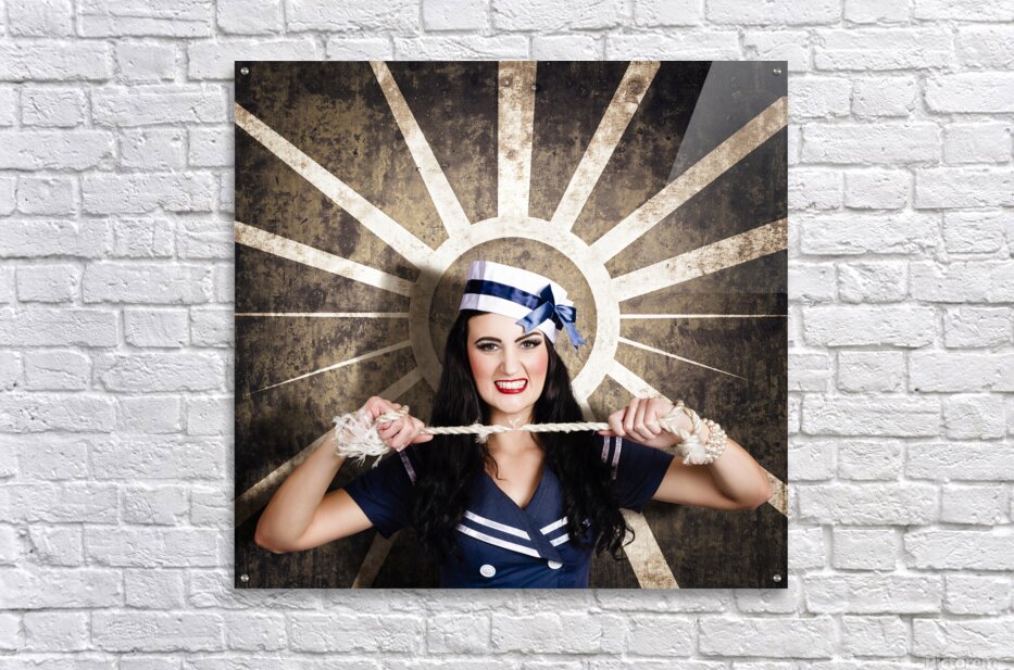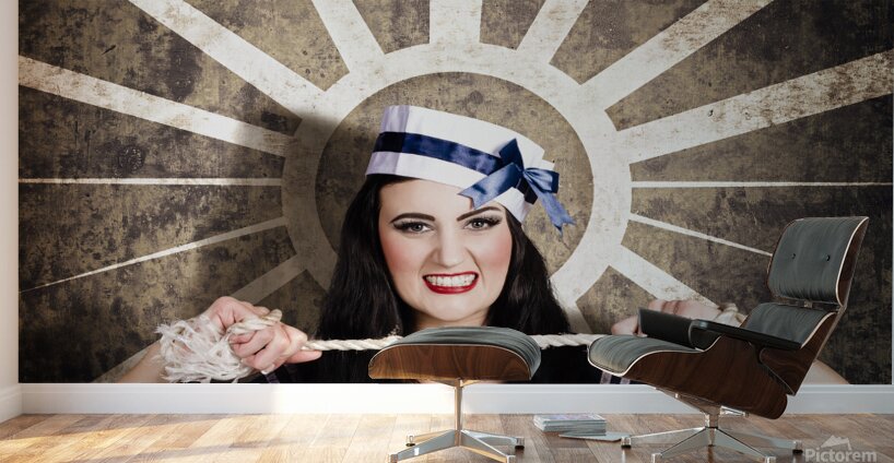 Sailor girl portrait. Beautiful young sexy woman breaking navy rope in retro makeup and hairstyle. Vintage design background
