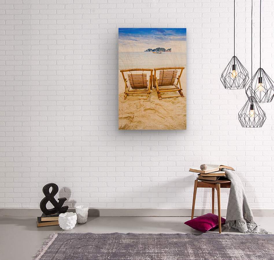Two Wooden Recliner Chairs Sit On A Thailand Tropical Island Beach Location With Longboat On The Distant Waters Photograph Taken Phi Phi Island Thaila...[+]