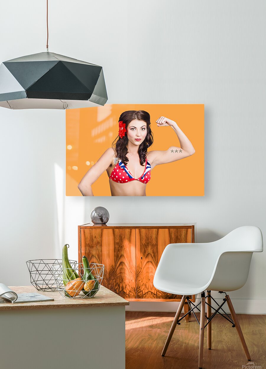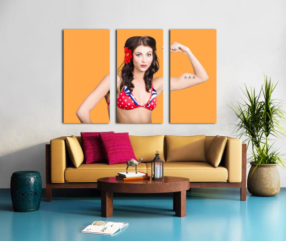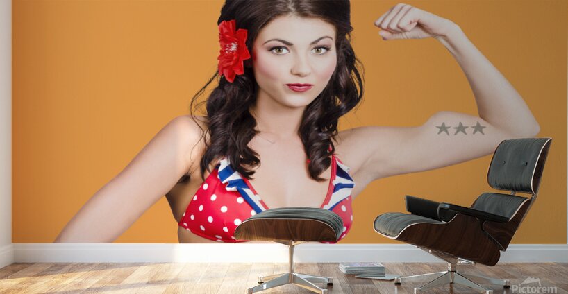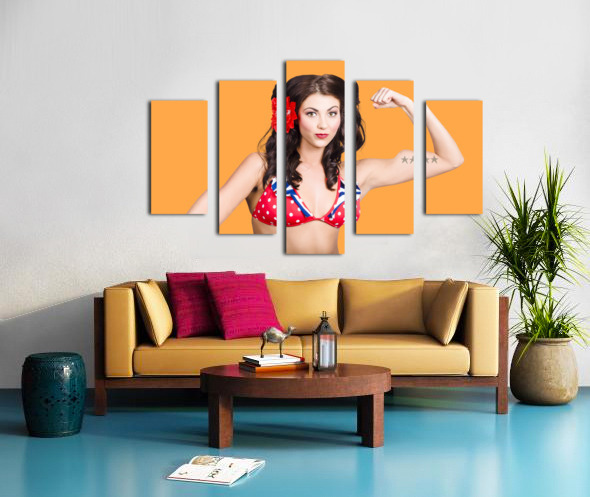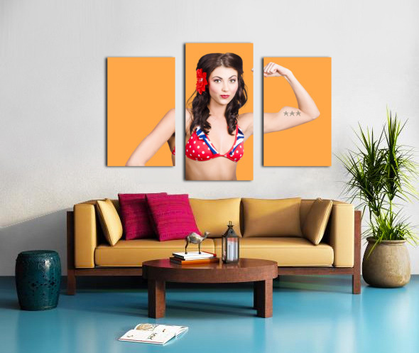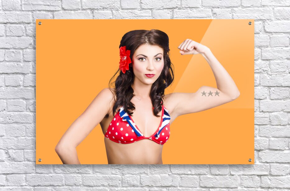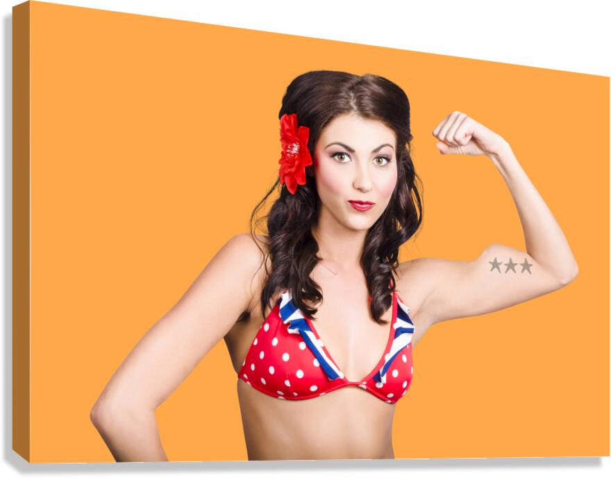 Pinup girl flexing biceps muscle. Bodybuilding Frame print