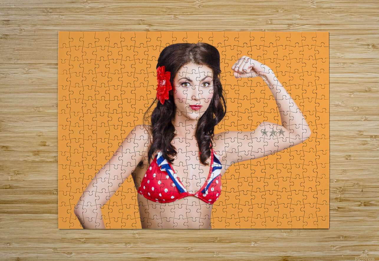 Pinup girl flexing biceps muscle. Bodybuilding Jorgo Puzzle printing