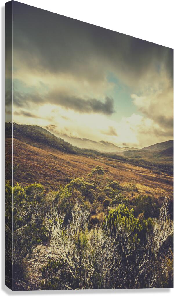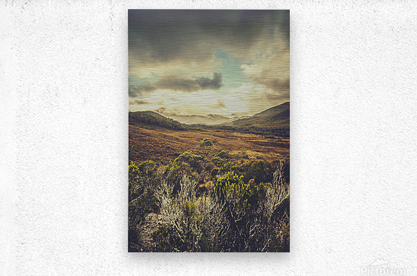 Majestic landscape scene of distant fog covered mountains mid-range meadows and closeup vegetation. Southwest National Park Tasmania Australia