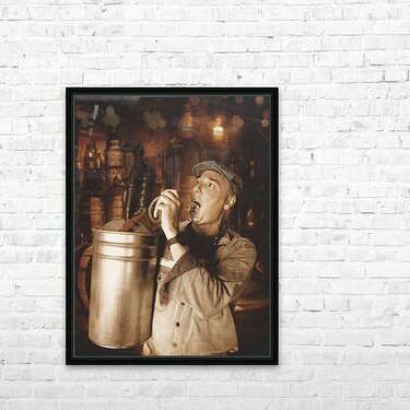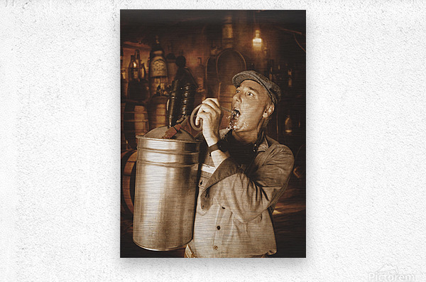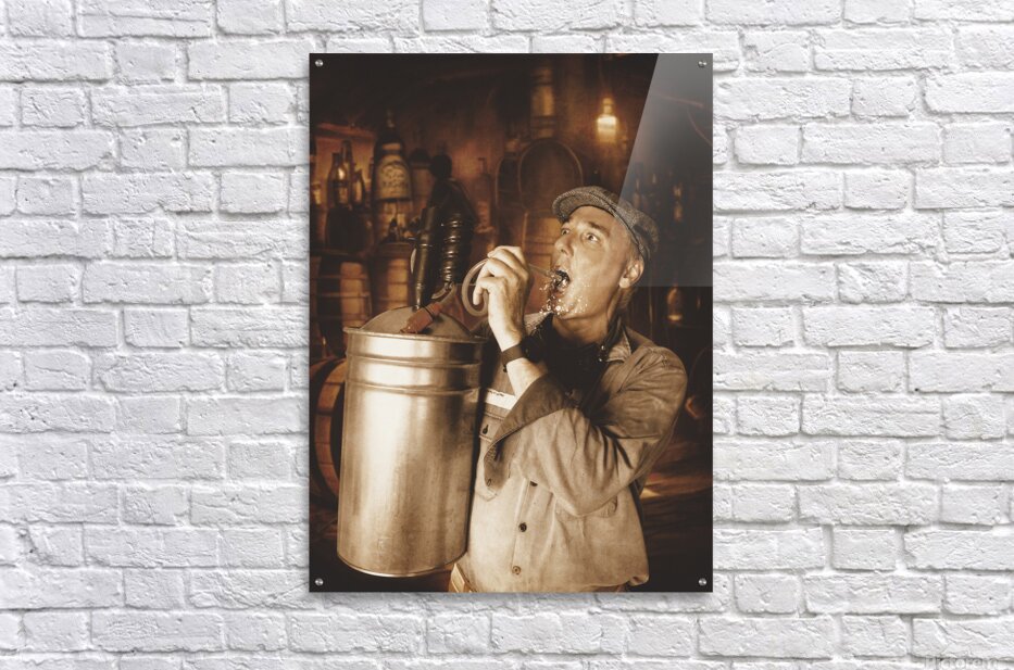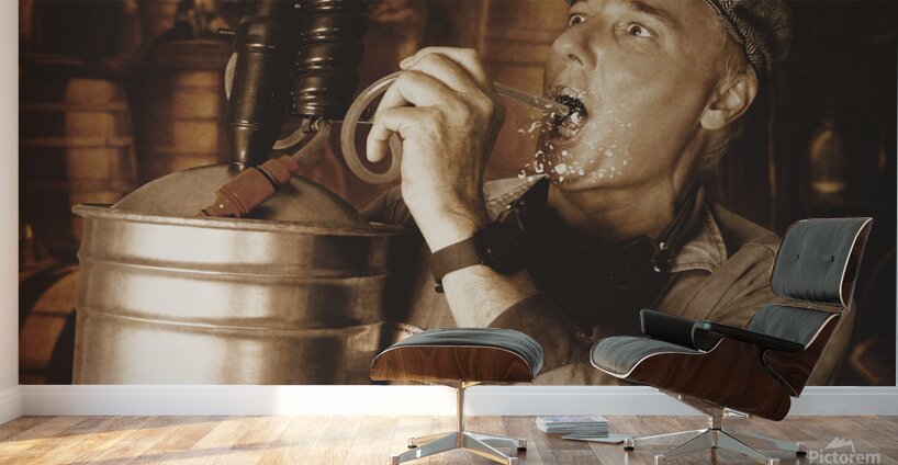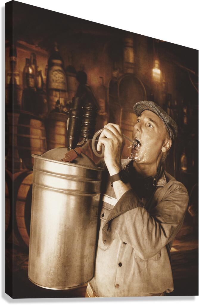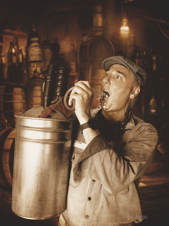 Humorous portrait on a distillery man filling the tank with a hard bootleg beverage