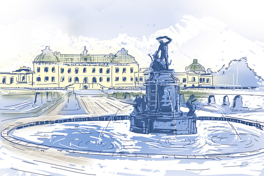 ABOUT THIS ARTWORK: DROTTNINGHOLMS SLOTT ROYAL PALACE AND FOUNTAIN ILLUSTRATION