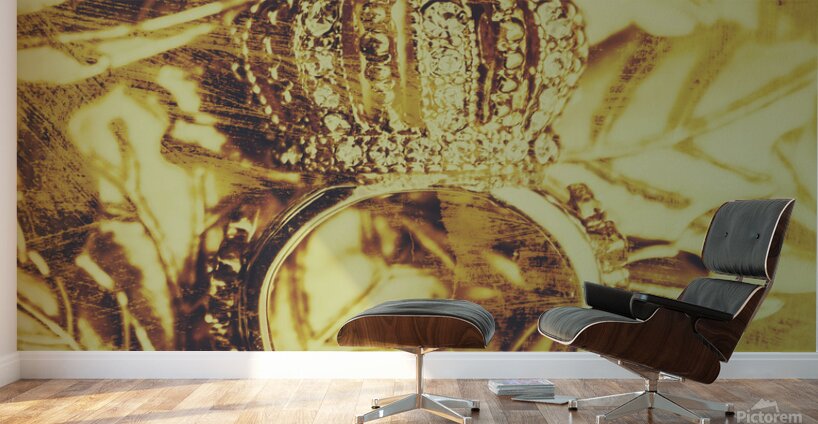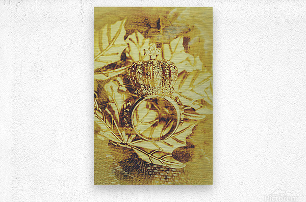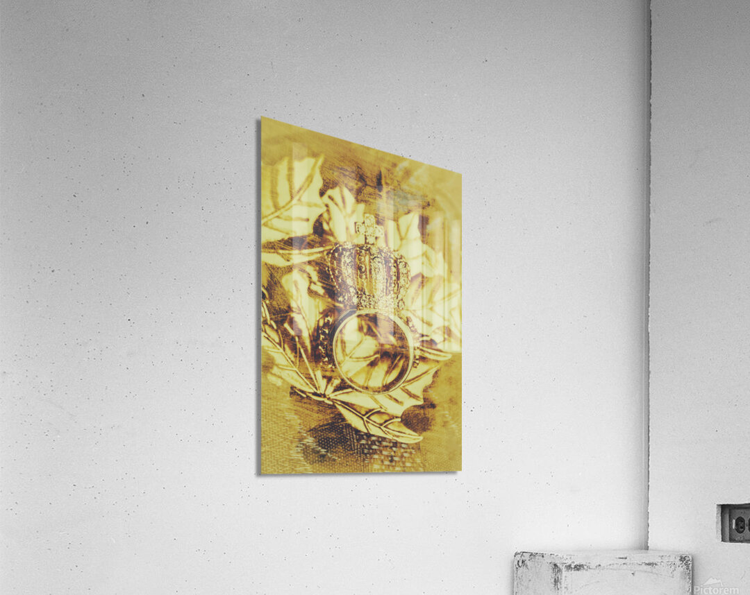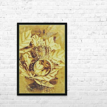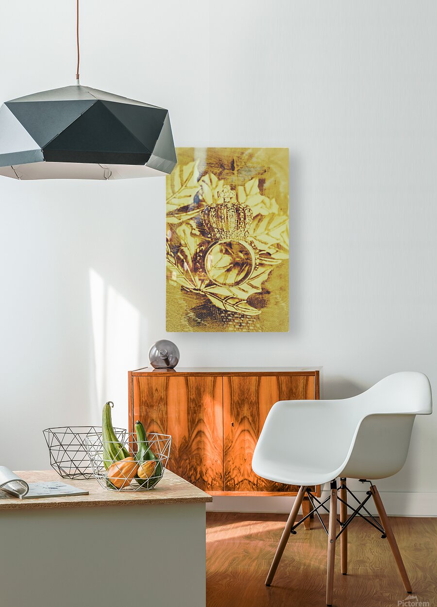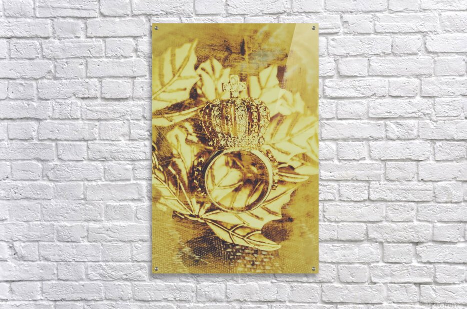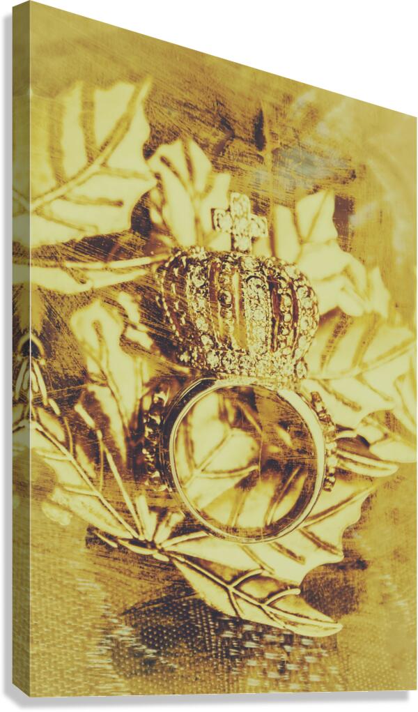 Golden crown shape ring with cross on top kings jewellery on bronze leaf statuette yellow background. Fit for a king