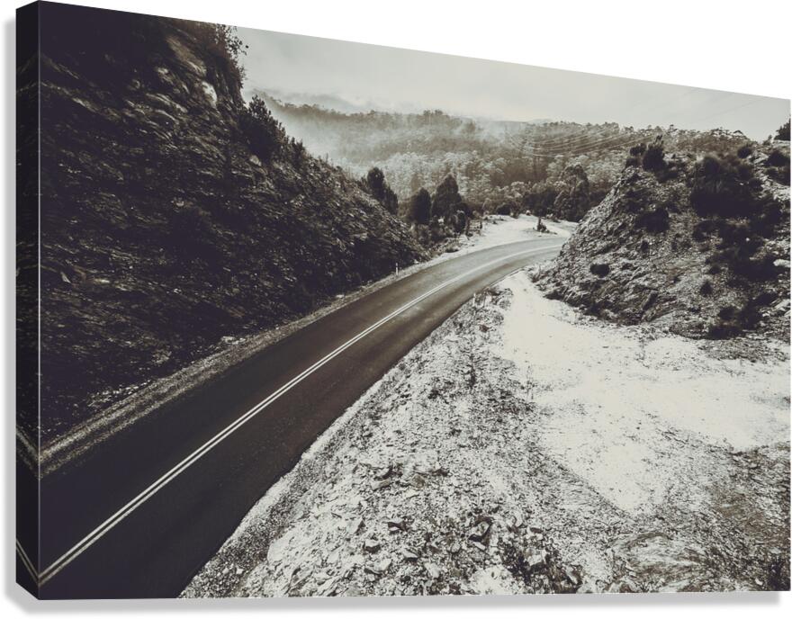 Dramatic winter landscape on a fog covered steep road touring around amazing Strathgordon Tasmania Australia