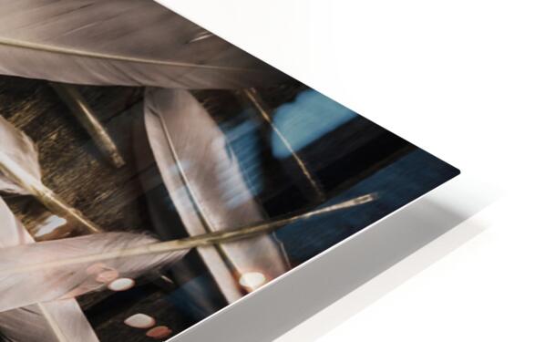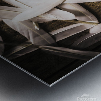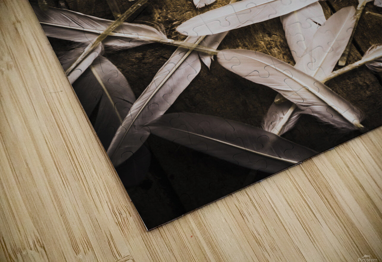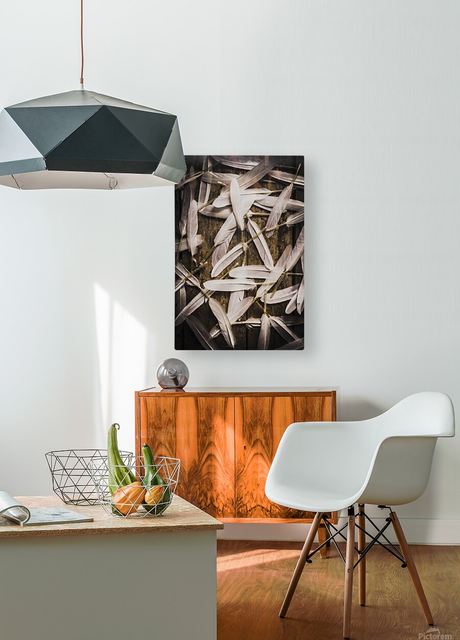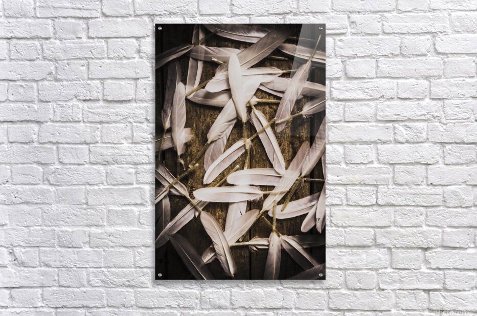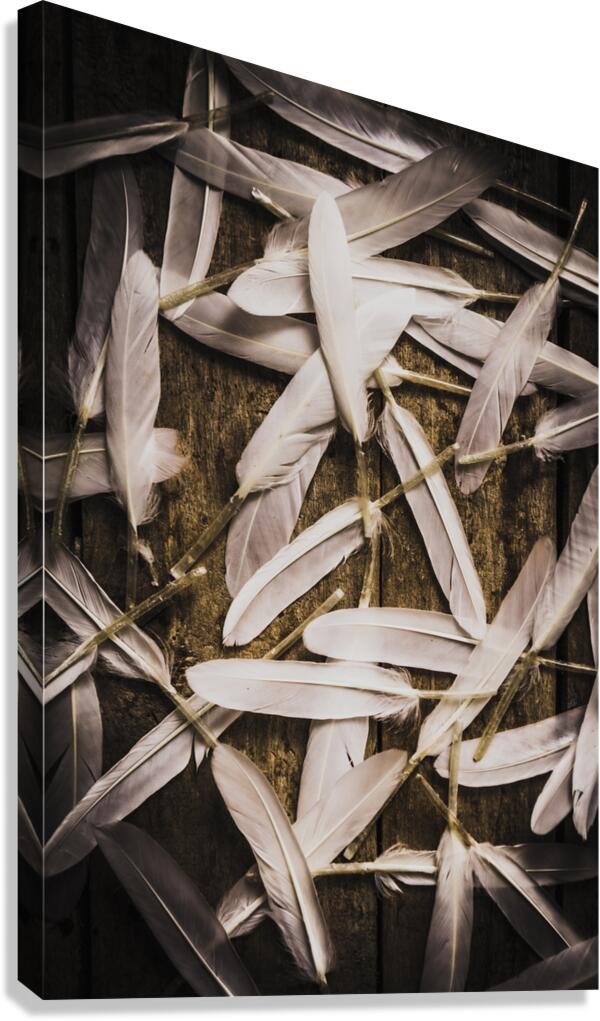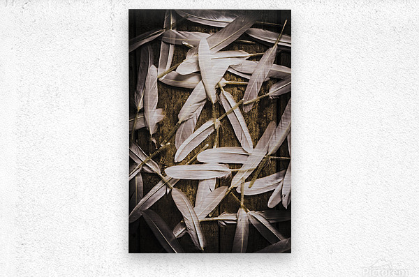 Abstract still life design of white feathers in scattered form on wooden background. Soft symbols of peace and hope