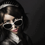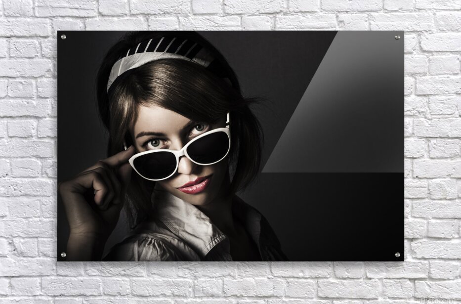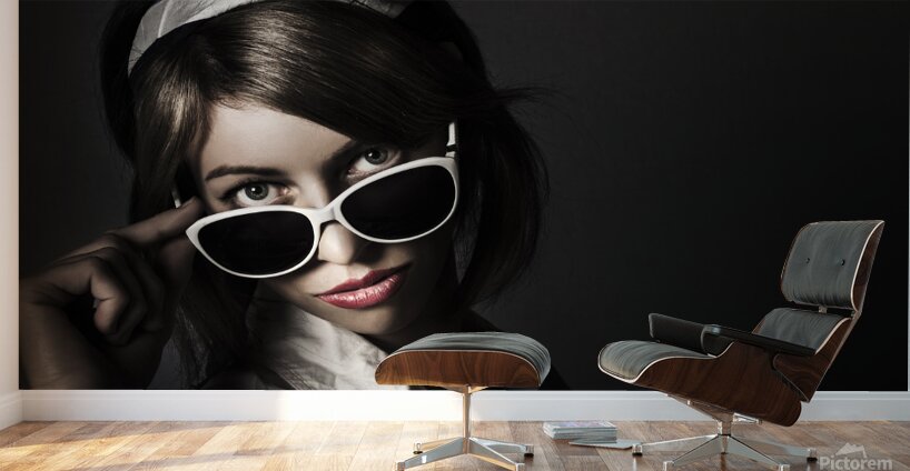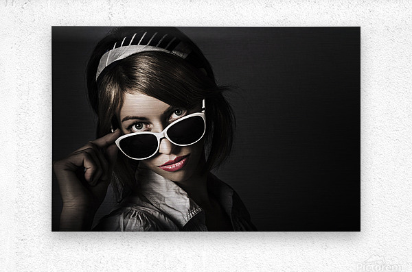Dark fashion portrait on the head of a beautiful fashion girl wearing retro pinup sunglasses on face with attractive short brunette hair style and pre...[+]