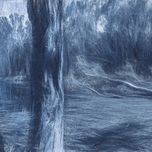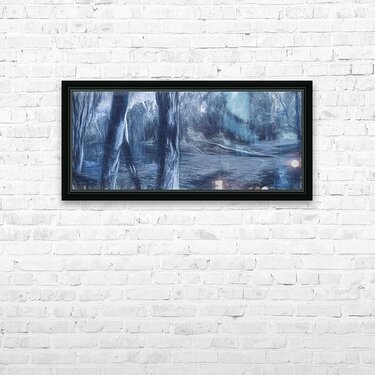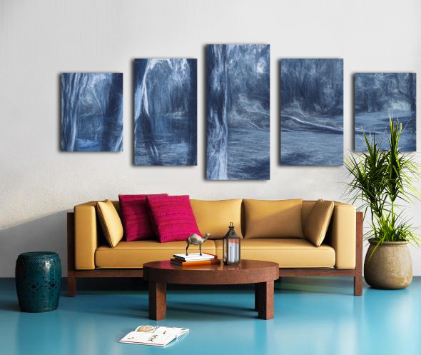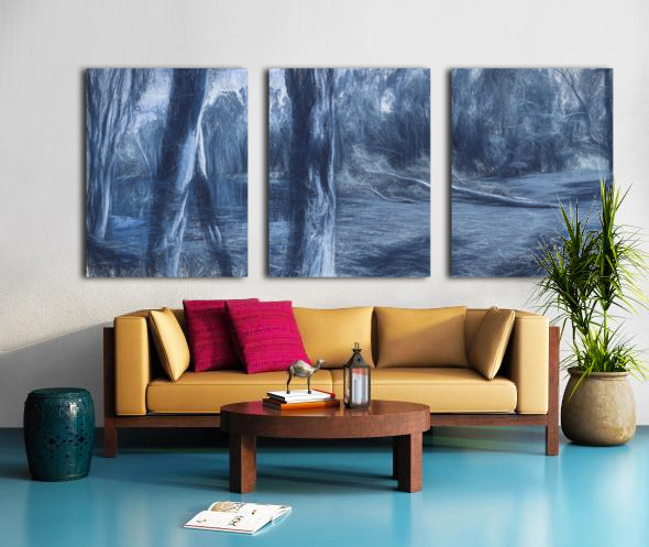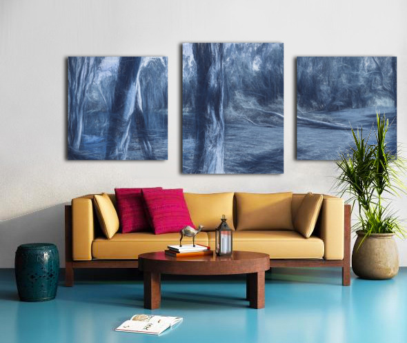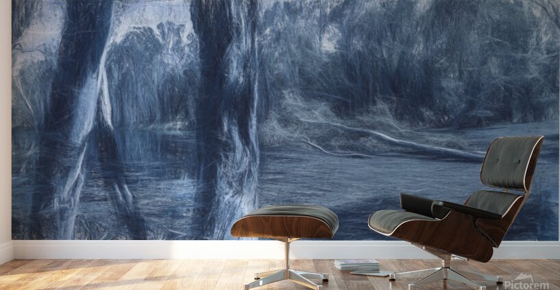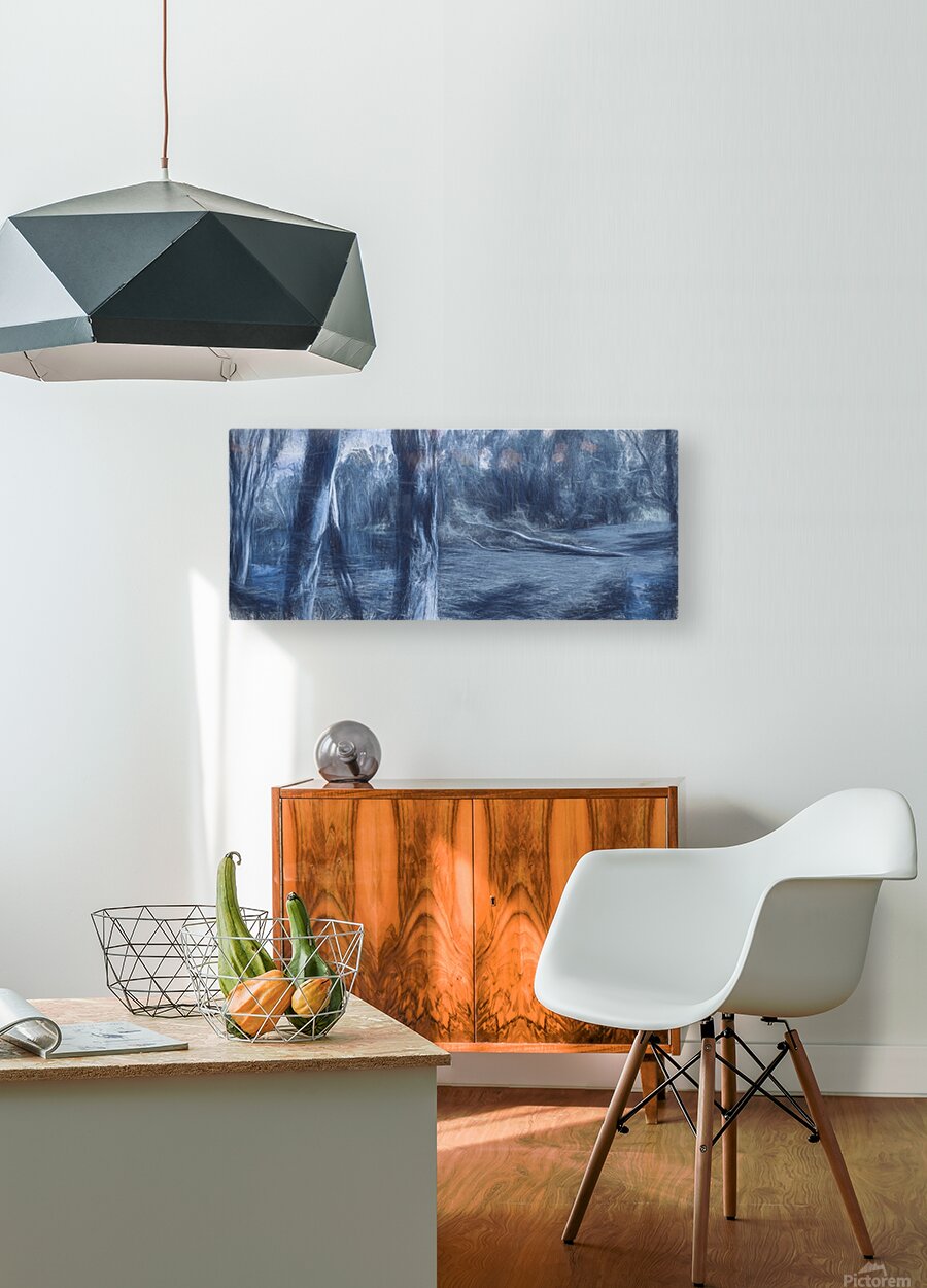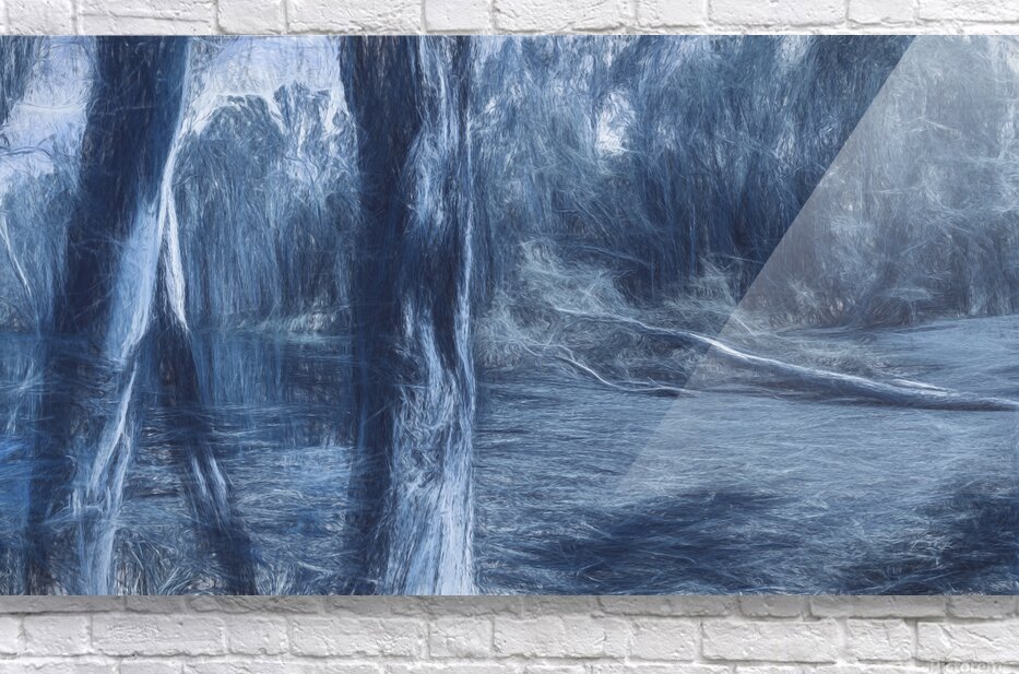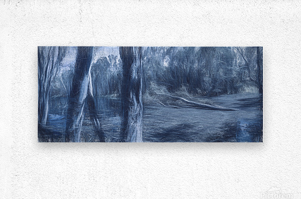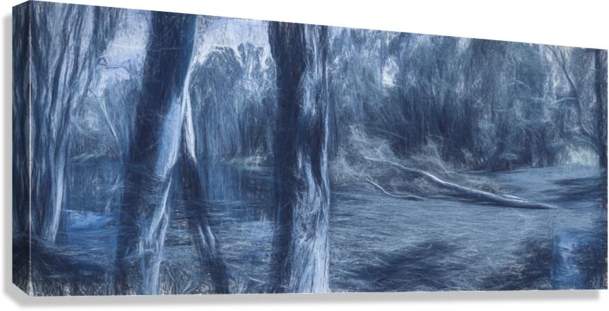 Creative fine art landscape drawing of a blue forest with creek and fallen eucalyptus tree. Reflections from blue yonder