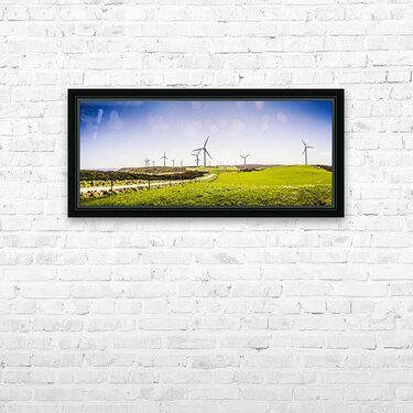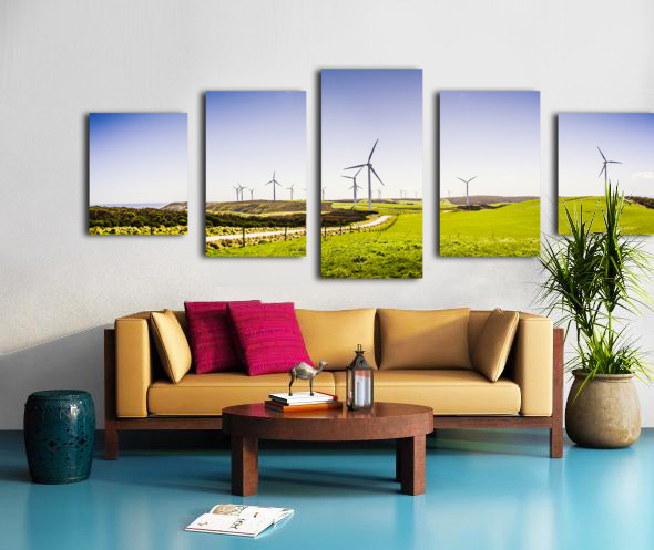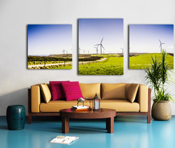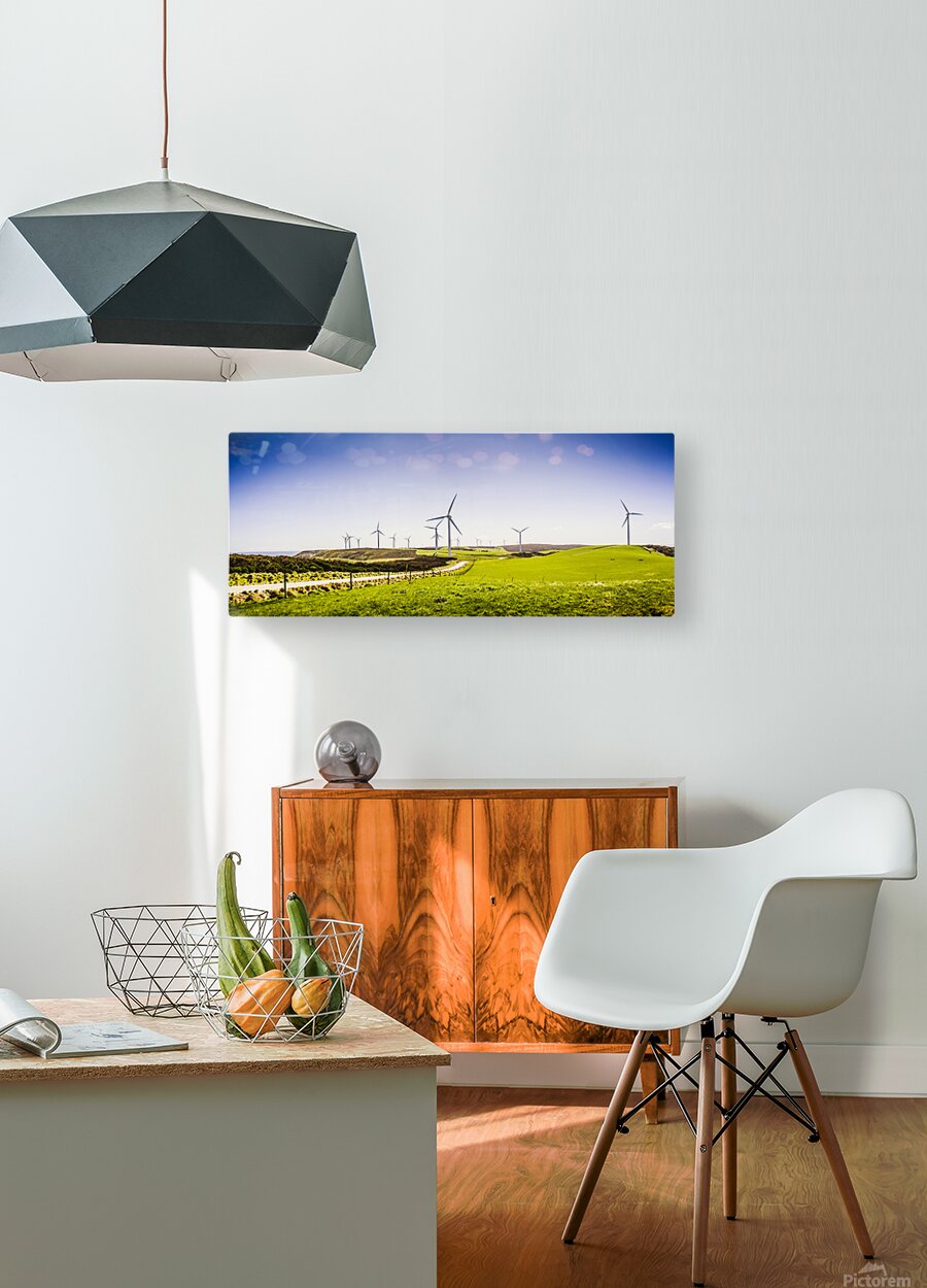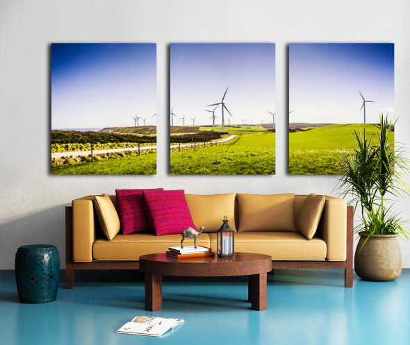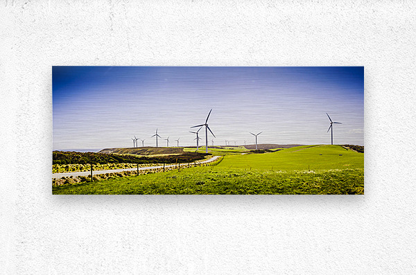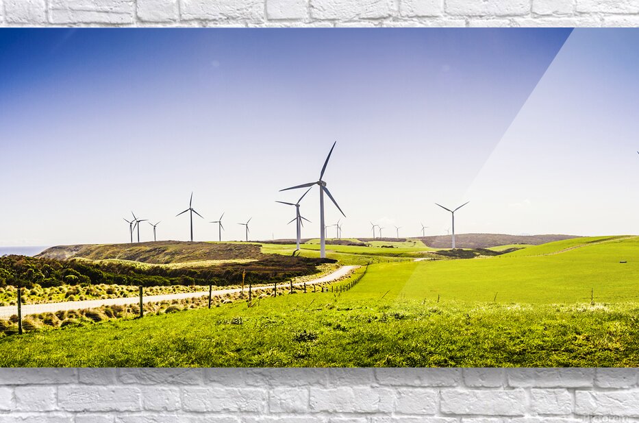 Fine art landscape on a wide angle scene of environmental wind powered turbines on colourful green grassland. Woolnorth North-West Tasmania Australia