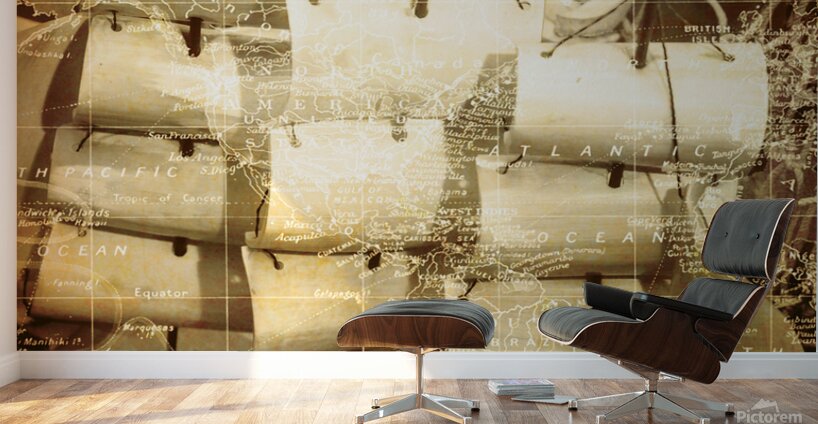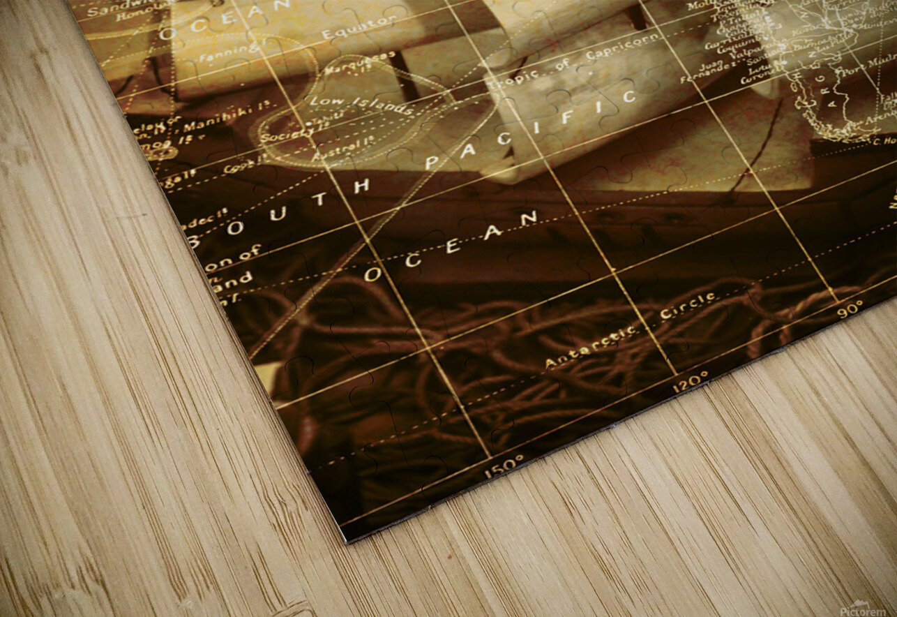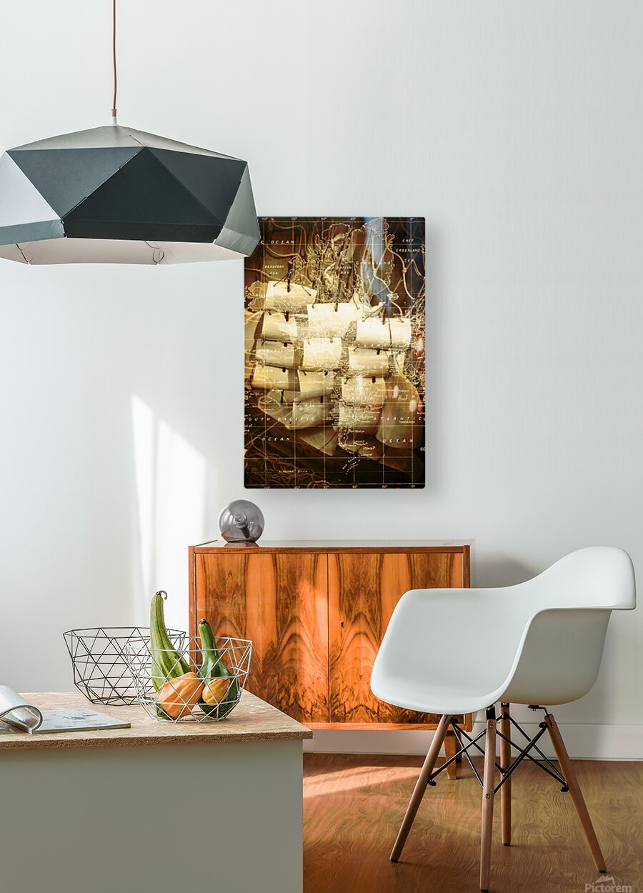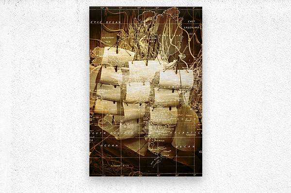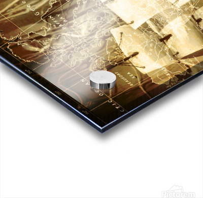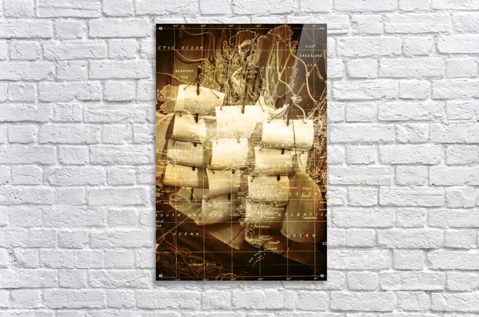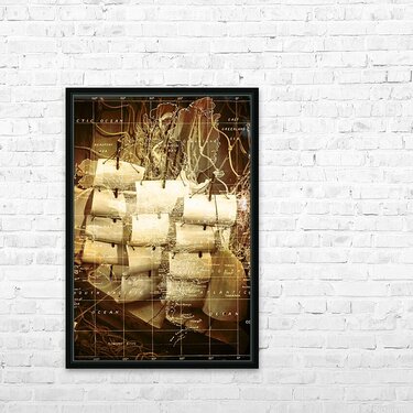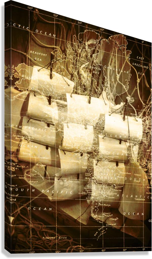 Maritime fine art scene on a vintage model sailing boat overlaid with vintage world map. The Nautical Atlas