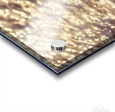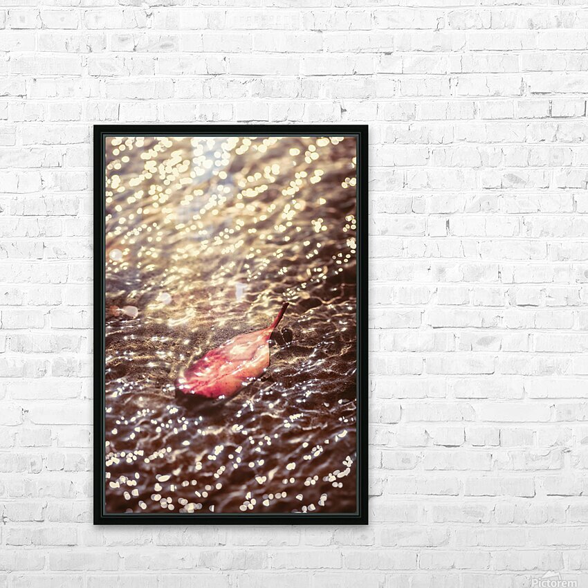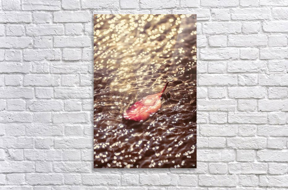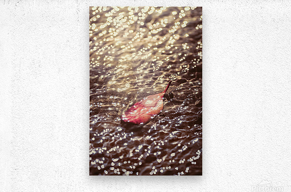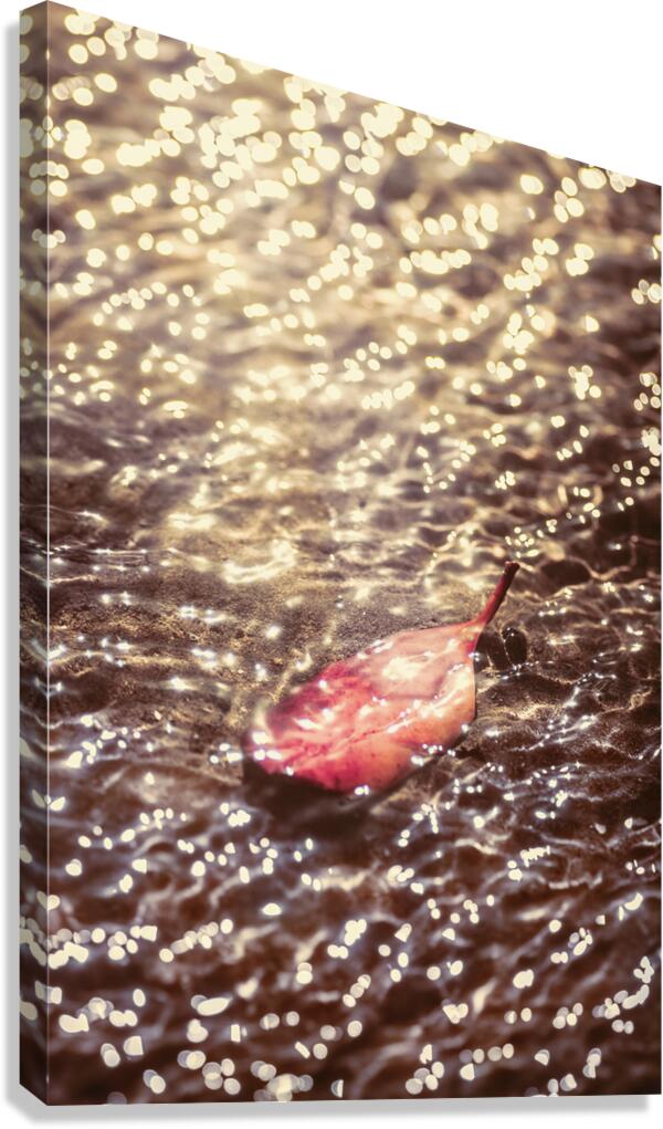Water ripples pour over a fallen autumn leaf submerged by lucent reflections bouncing from the shallows of an oceans surface. The fall and the light merger