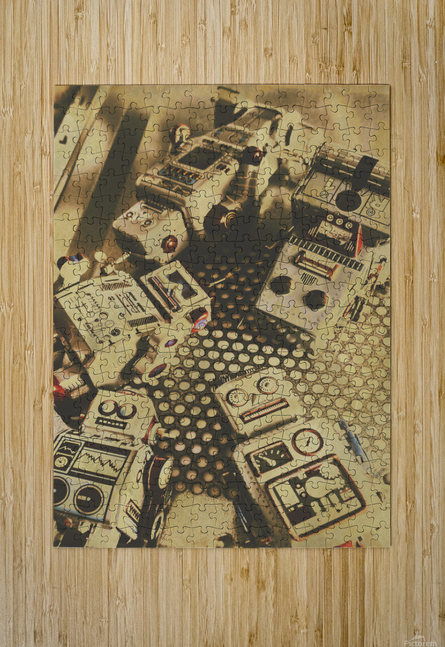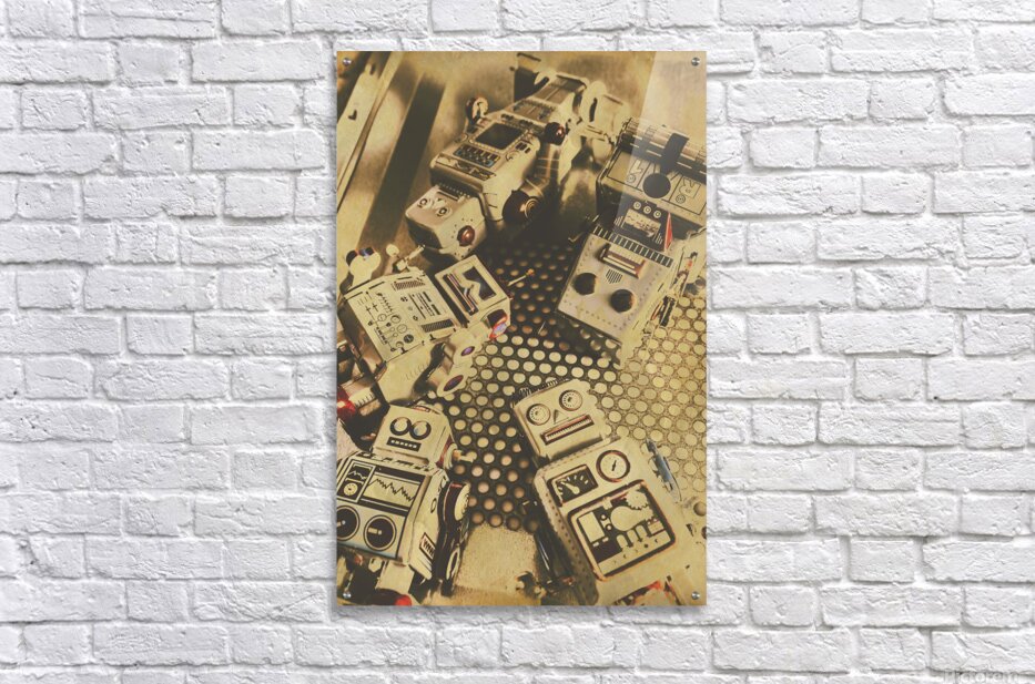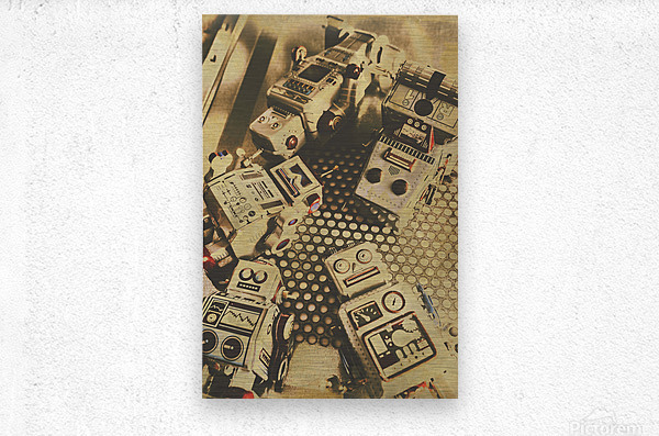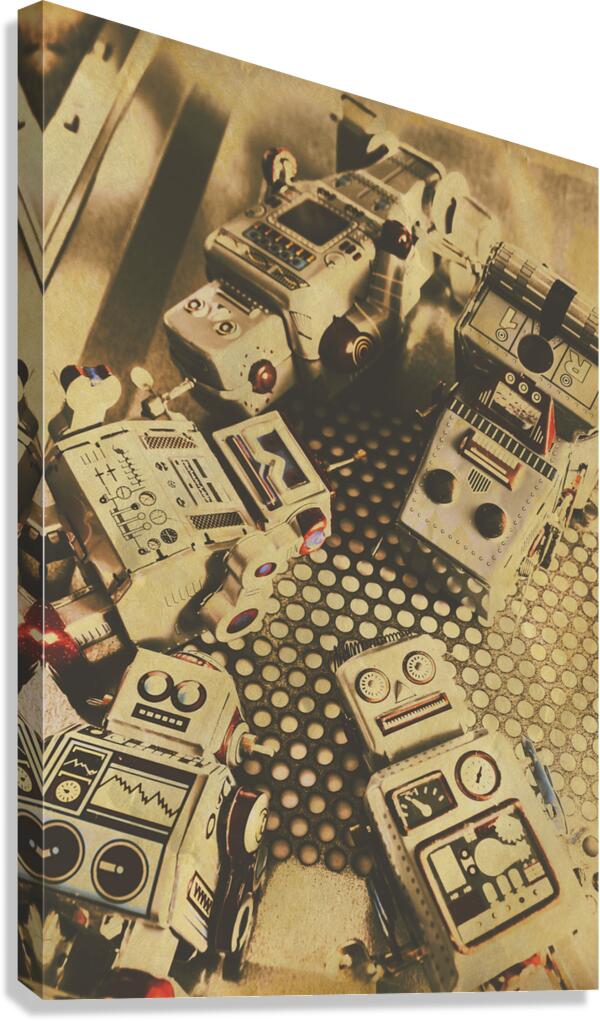 Old fashioned still life artwork on a heap of mechanical robots out of power. Vintage robot charging zone