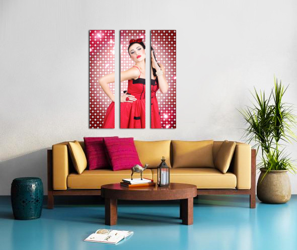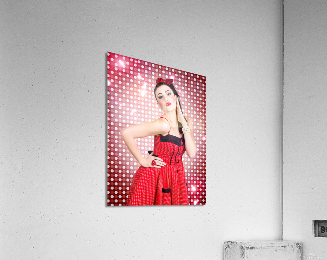 Portrait of disco party dancing girl posing on a bright red dance club background