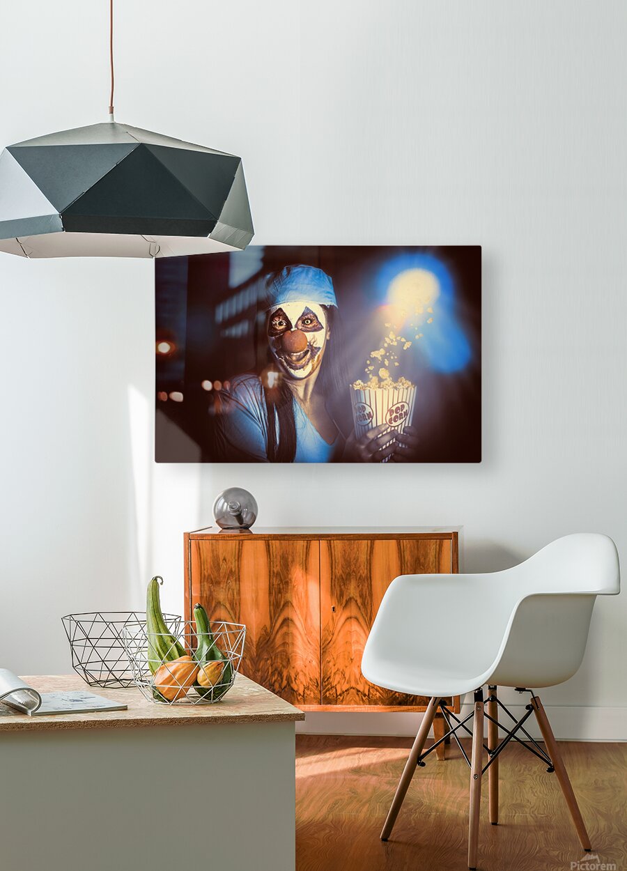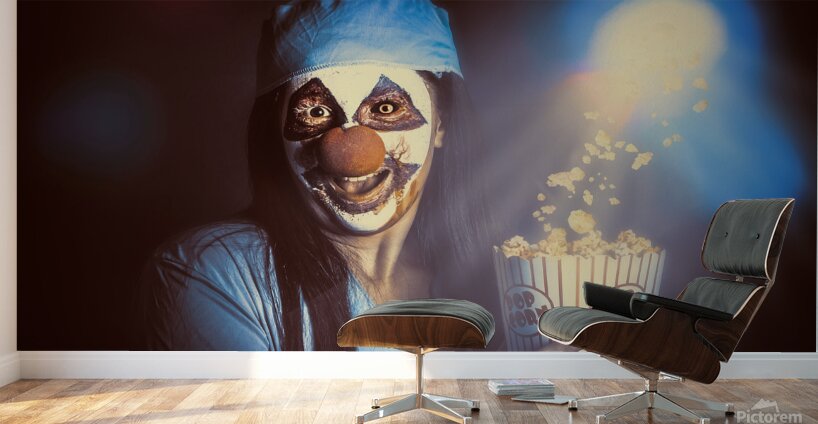 Get this artwork "Scary clown watching horror movie in THEATER" in a framed print.
