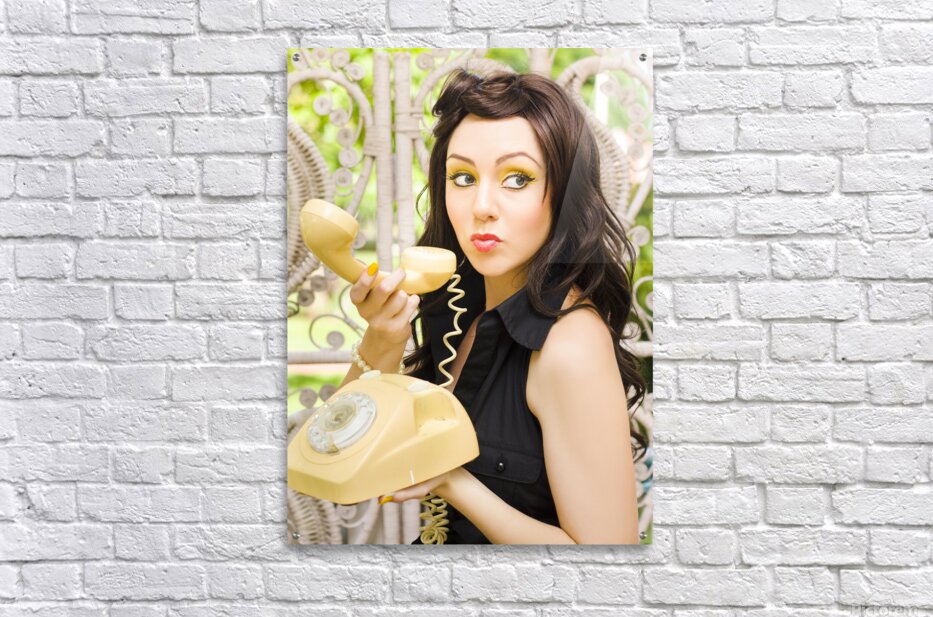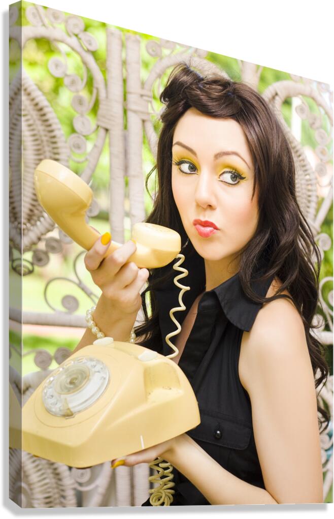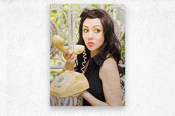 Anxious And Nervous Pretty Brunette Woman Glances Over Her Should With A Sneaky And Mischievous Expression While Making A Phone Call On A Retro Teleph...[+]