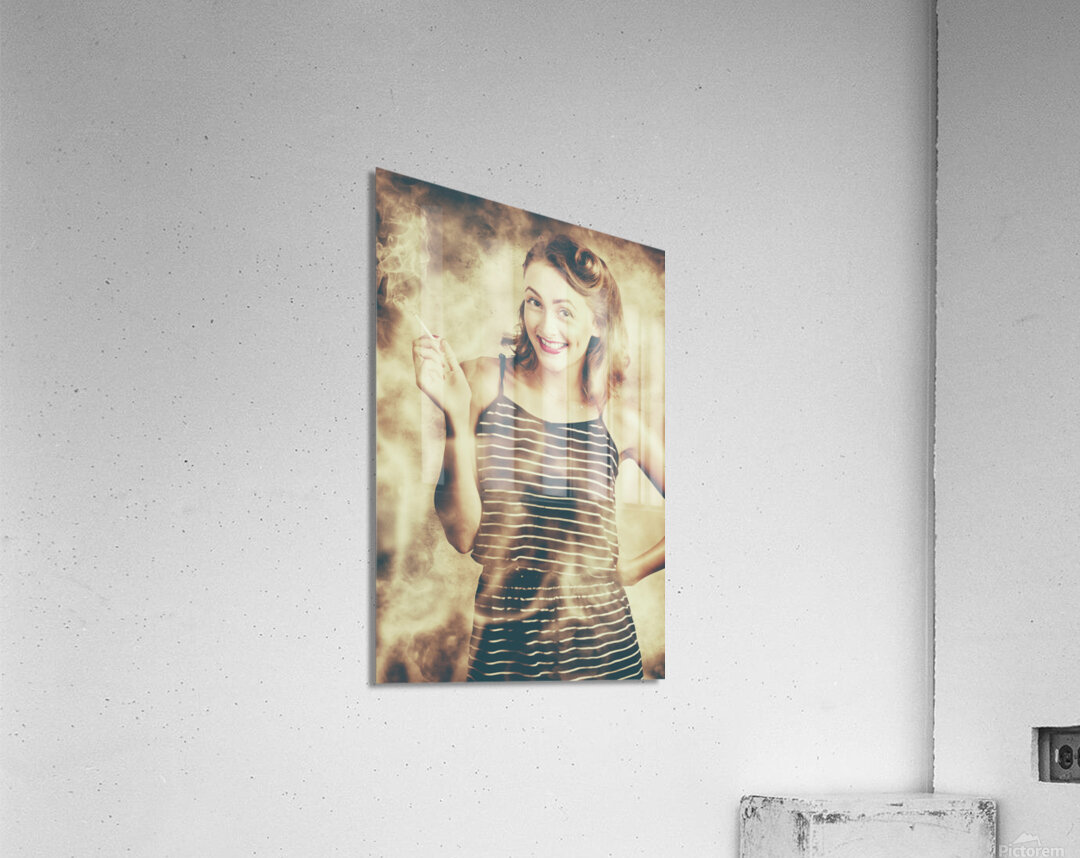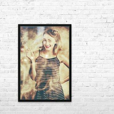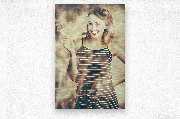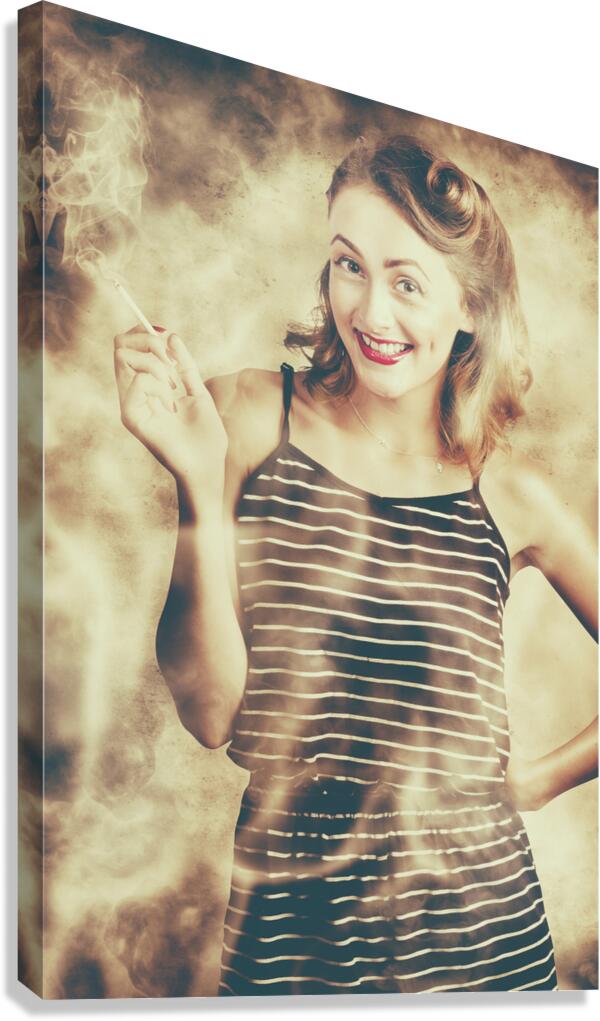 Funny retro portrait of beautiful sixties woman smiling cheerily with cigarette in a haze of period attire. Smoking hot pin-up housewife