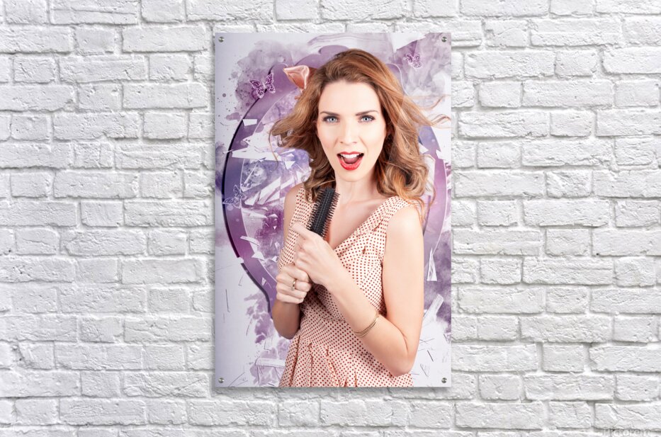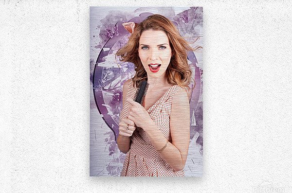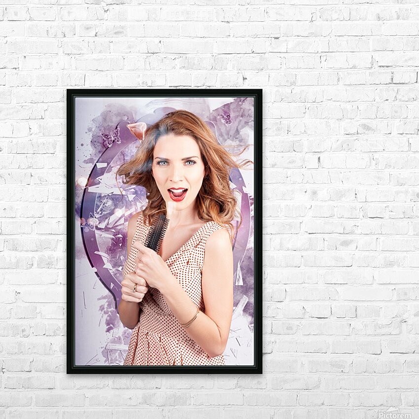 Attractive young brunette salon girl shattering the glass of beauty when singing into a hair comb. Smashing hair style
