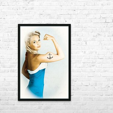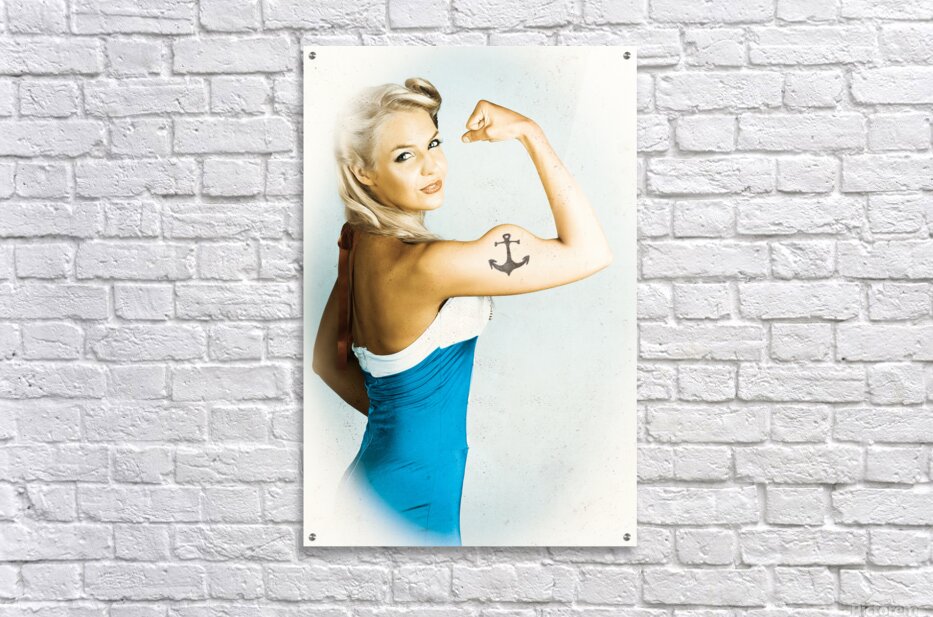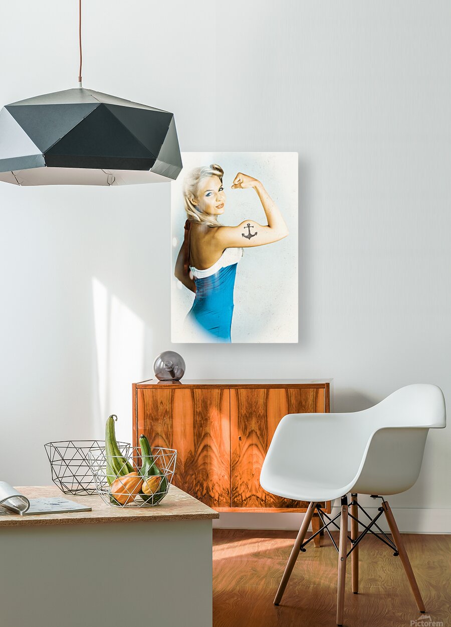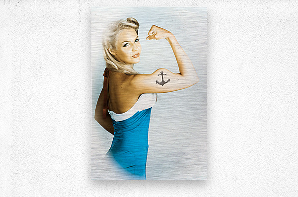 Vintage styled photo on a weathered marine gal flexing maritime muscles in a nautical display of pin-up pride