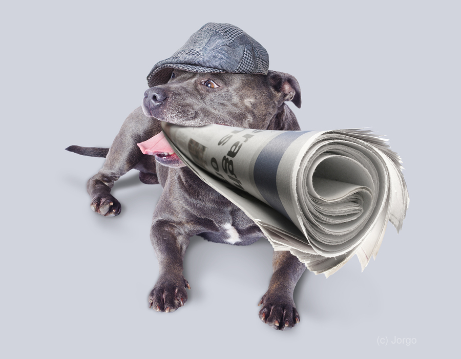 ISOLATED NEWSPAPER DOG CARRYING LATEST NEWS