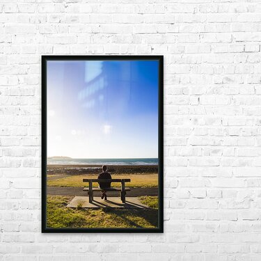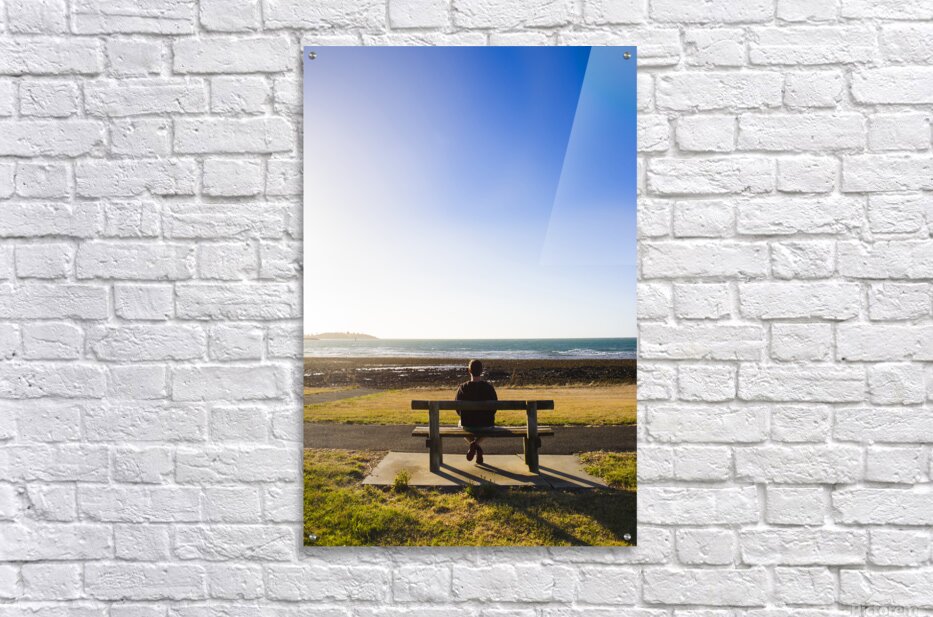 Lifestyle photography of a male tourist enjoying an ocean landscape sunset on a park bench seat while on seaside vacation to East Devonport Tasmania A...[+]