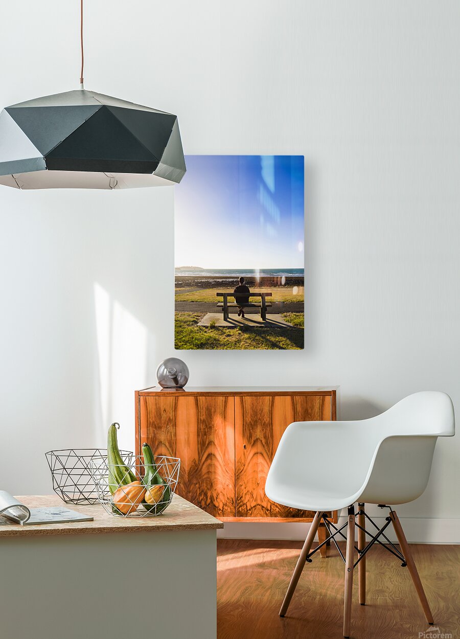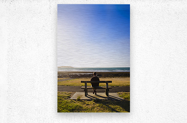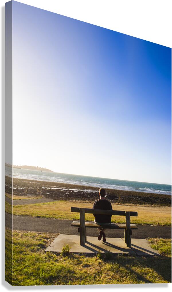 Lifestyle photography of a male tourist enjoying an ocean landscape sunset on a park bench seat while on seaside vacation to East Devonport Tasmania Australia