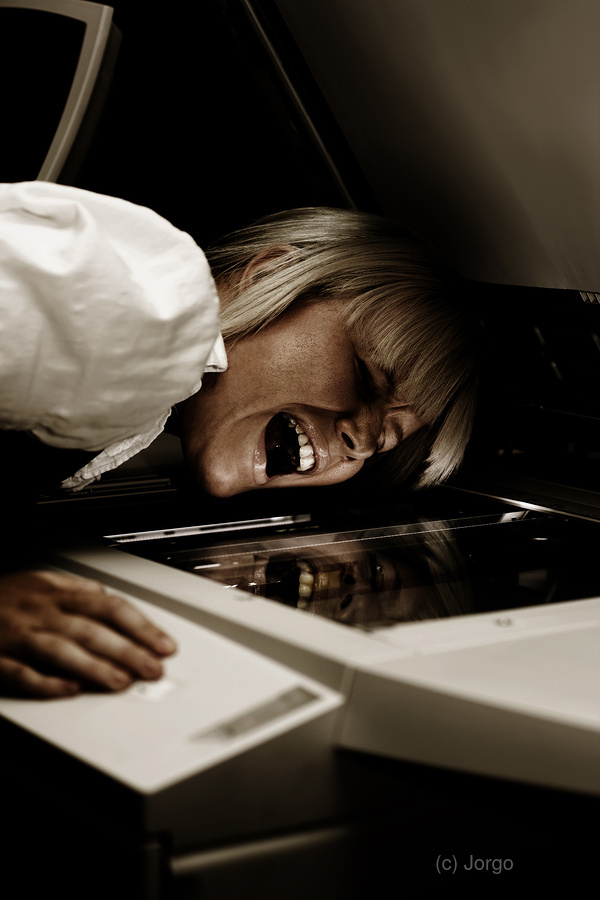 A Working Woman Screams On A Photocopier Proving The Darkened Horror Of Day-To-Day Replication Can Be A Killer
