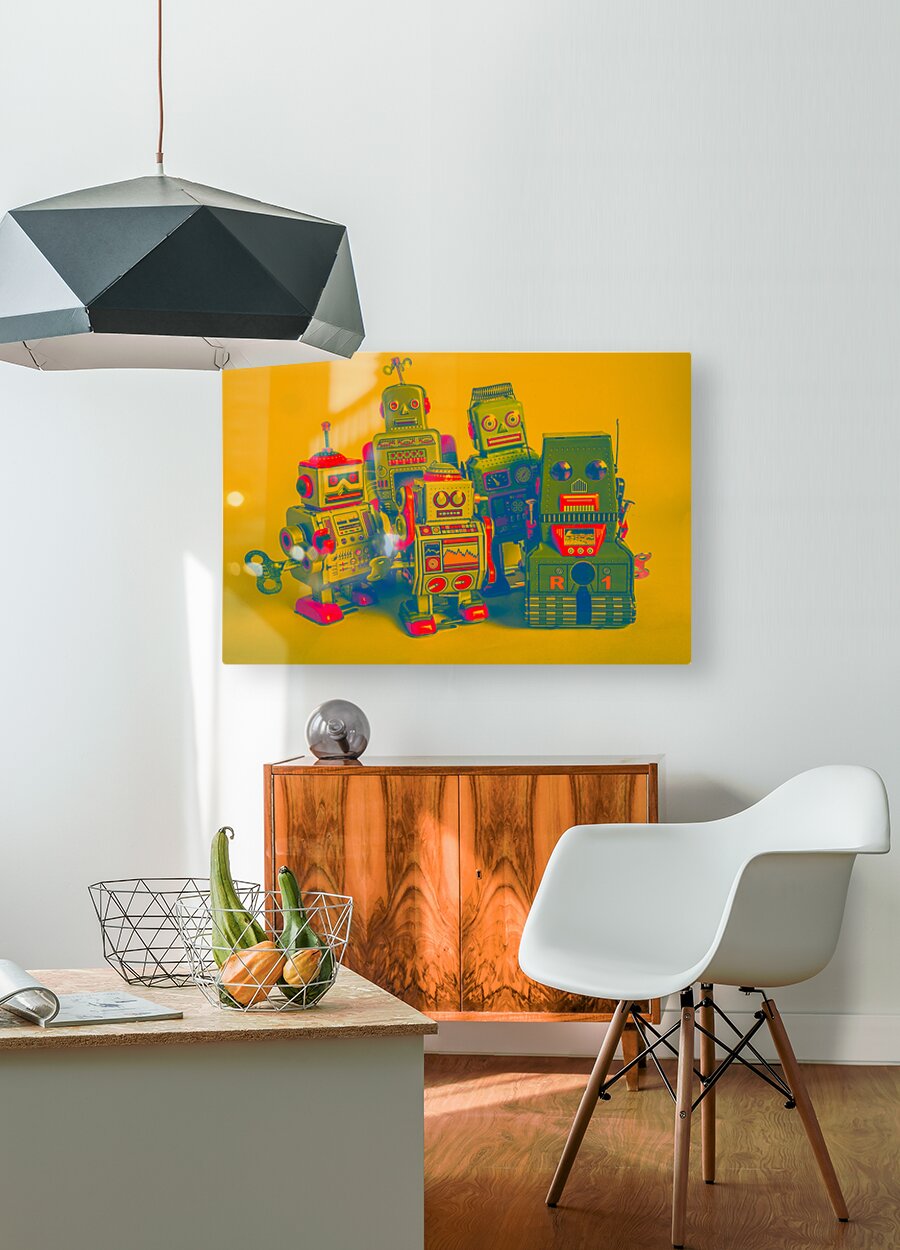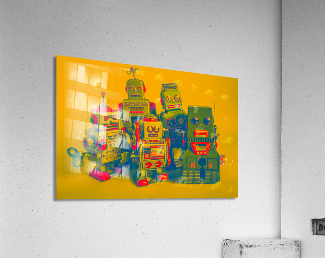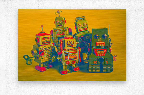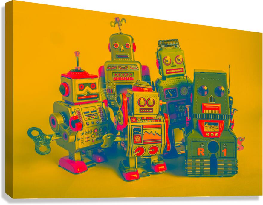Retro antiques in collectable still life with tin toy robots in faded orange style
