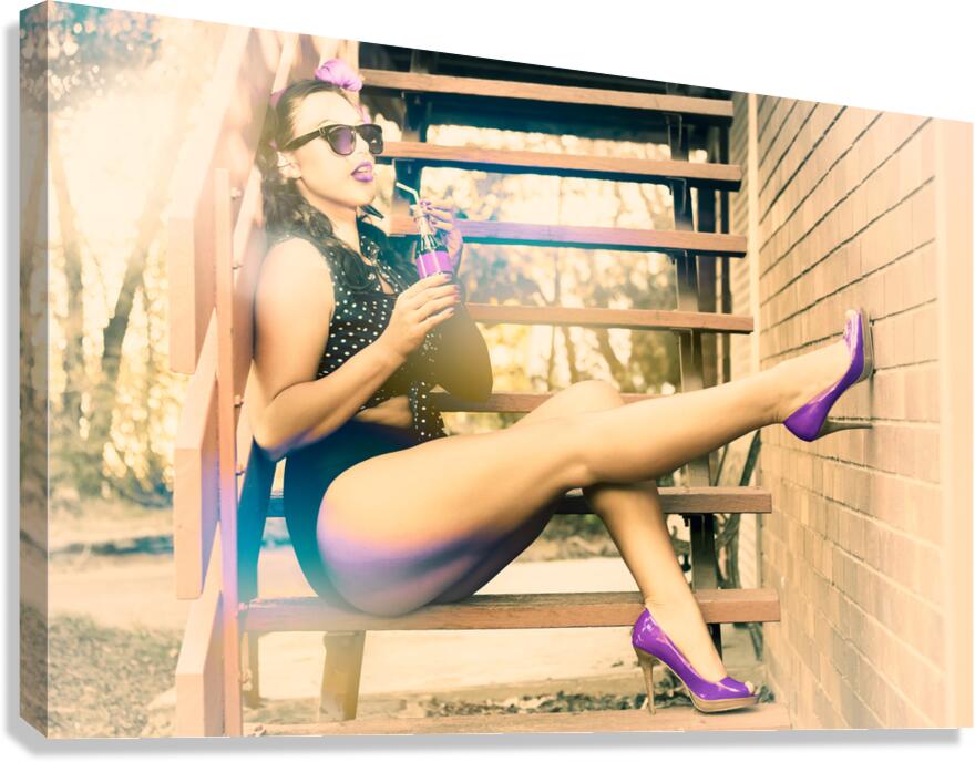Cool and funky photograph of a hip pin up girl wearing purple high heel shoes while sitting on the stairs at home drinking pop art soda in eighties pinup girls fashion
