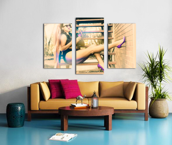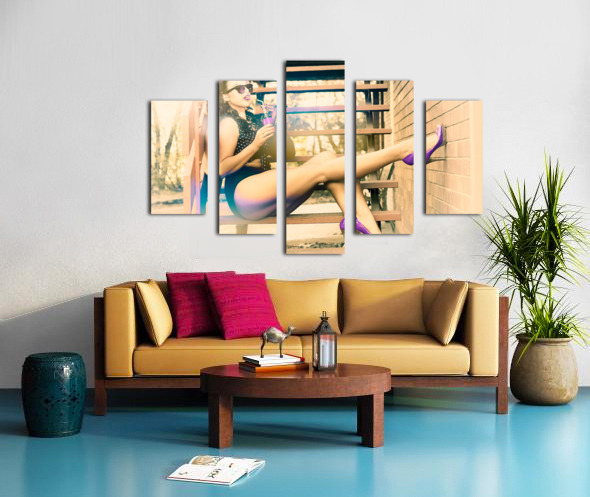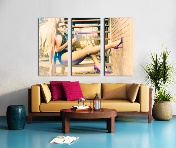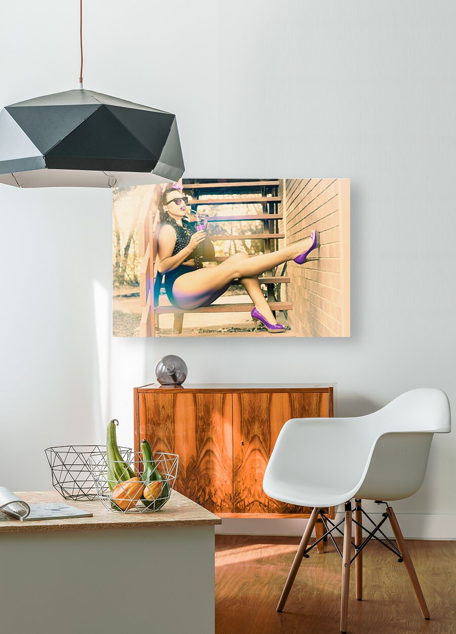 Cool and funky photograph of a hip pin up girl wearing purple high heel shoes while sitting on the stairs at home drinking pop art soda in eighties pi...[+]