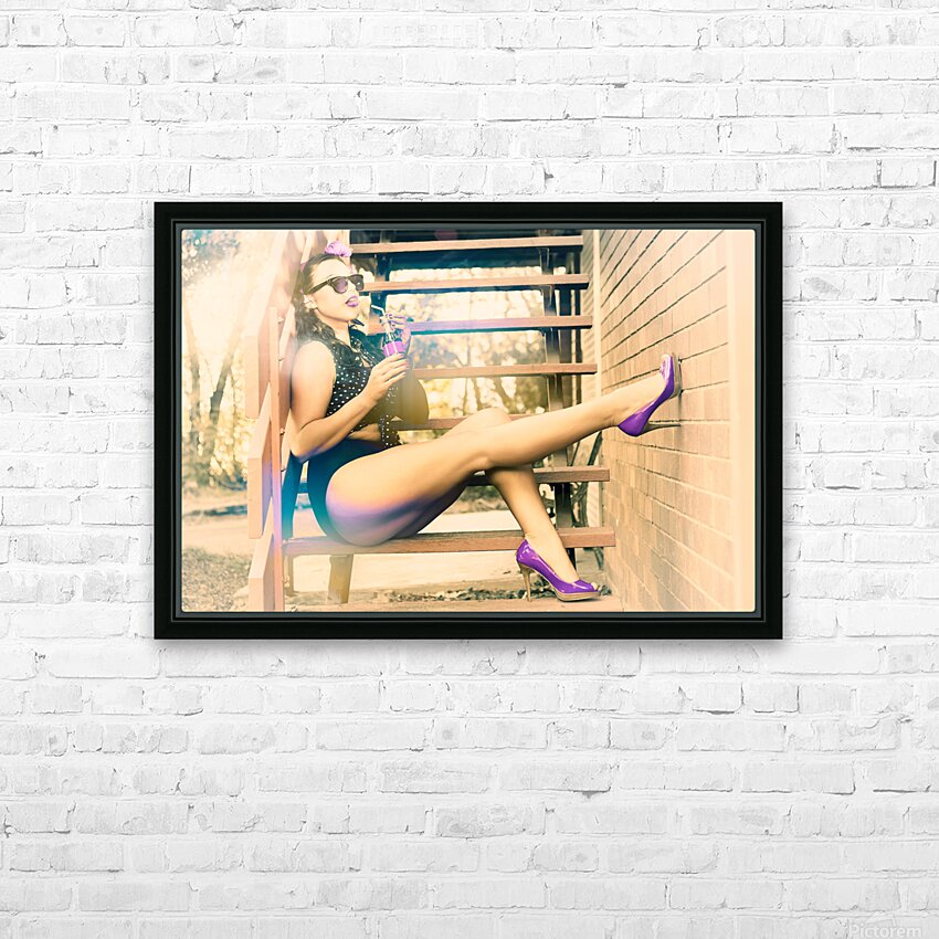 Eighties pinup woman drinking pop art soda Frame print