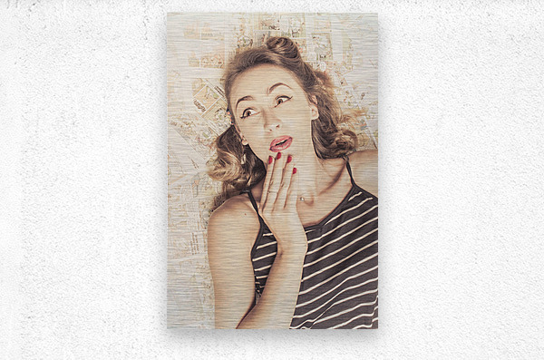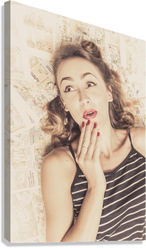 Vintage toned photo of surprised young pin up woman in classic make up and manicure wearing stripy top lying on pop art comic books. Comics collector pin up girl