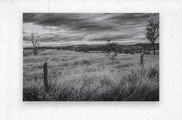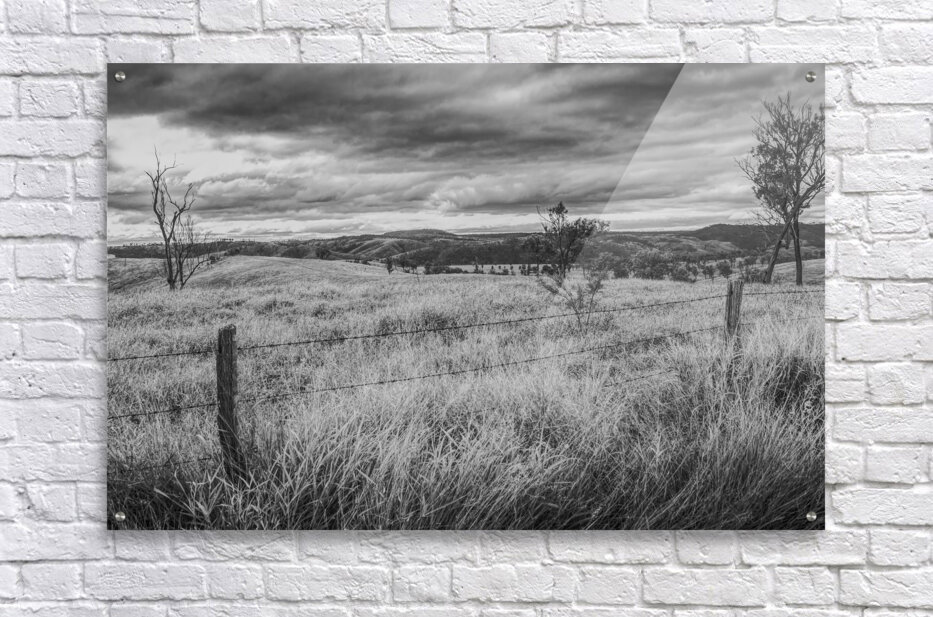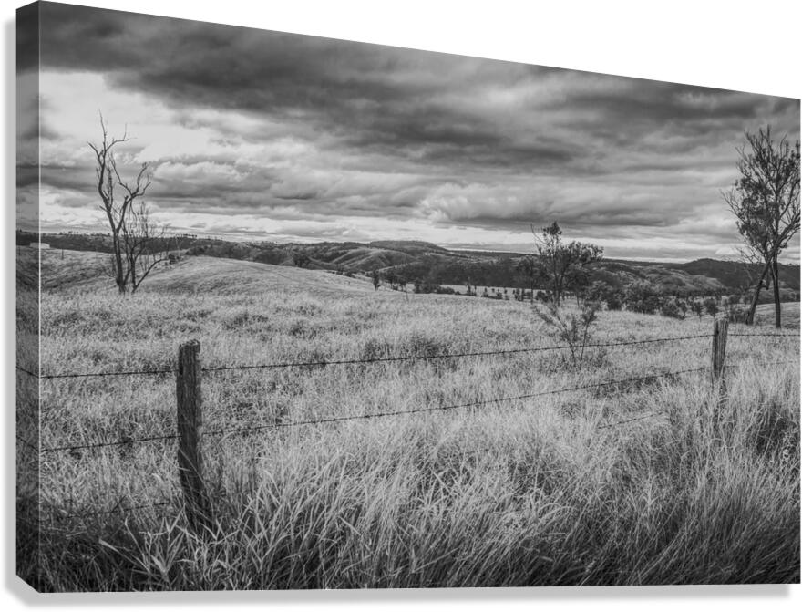 Regional ranching landscaped in a greyed out vista of rolling hills and moody skies. Waynes Hill Lookout Mundubbera Queensland Australia