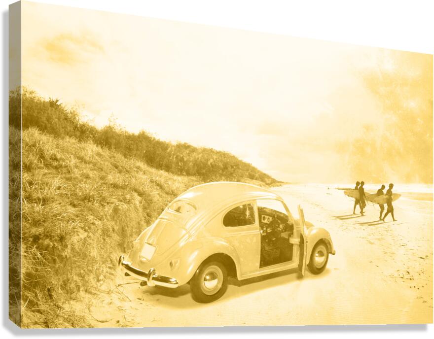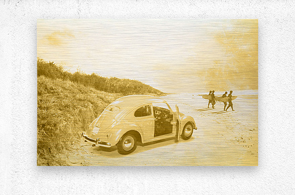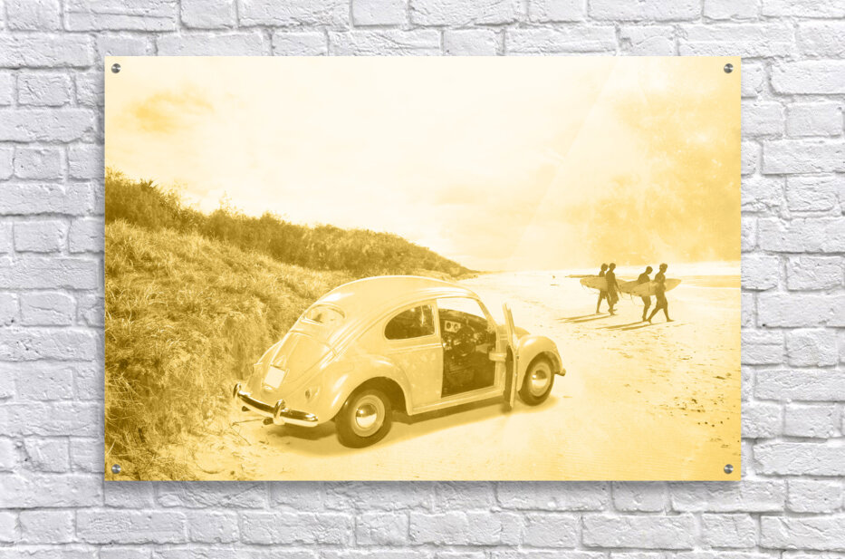 Faded Grainy Film Image Of Surfing In The 1960’s With Four Surfers Walking To The Waves From Their Beach Buggy