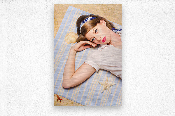 Retro portrait of an attractive young Australian pinup woman in 60s style lying down on beach towel with starfish and shell while sunbaking a beauty tan in the summer sun. Travel Australia