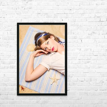 Hot retro pinup girl lying on beach in Australia Picture Frame Printing