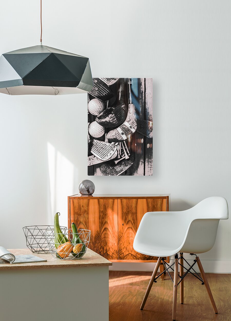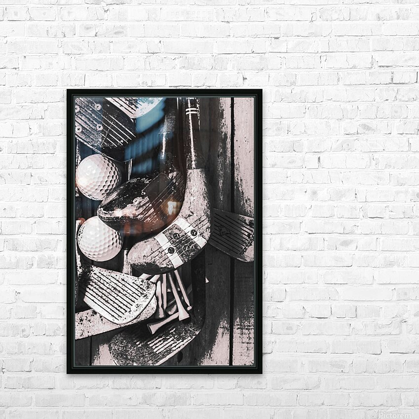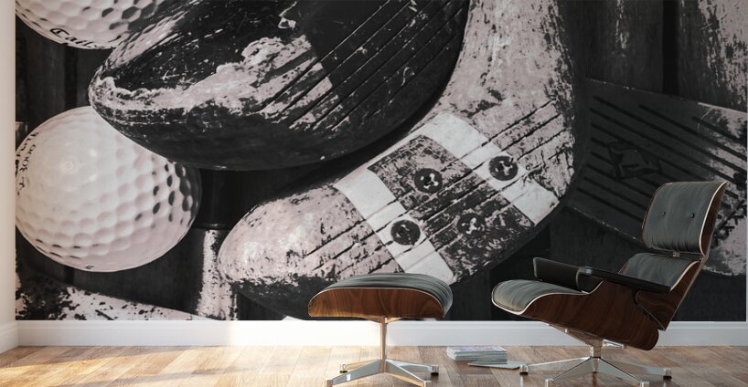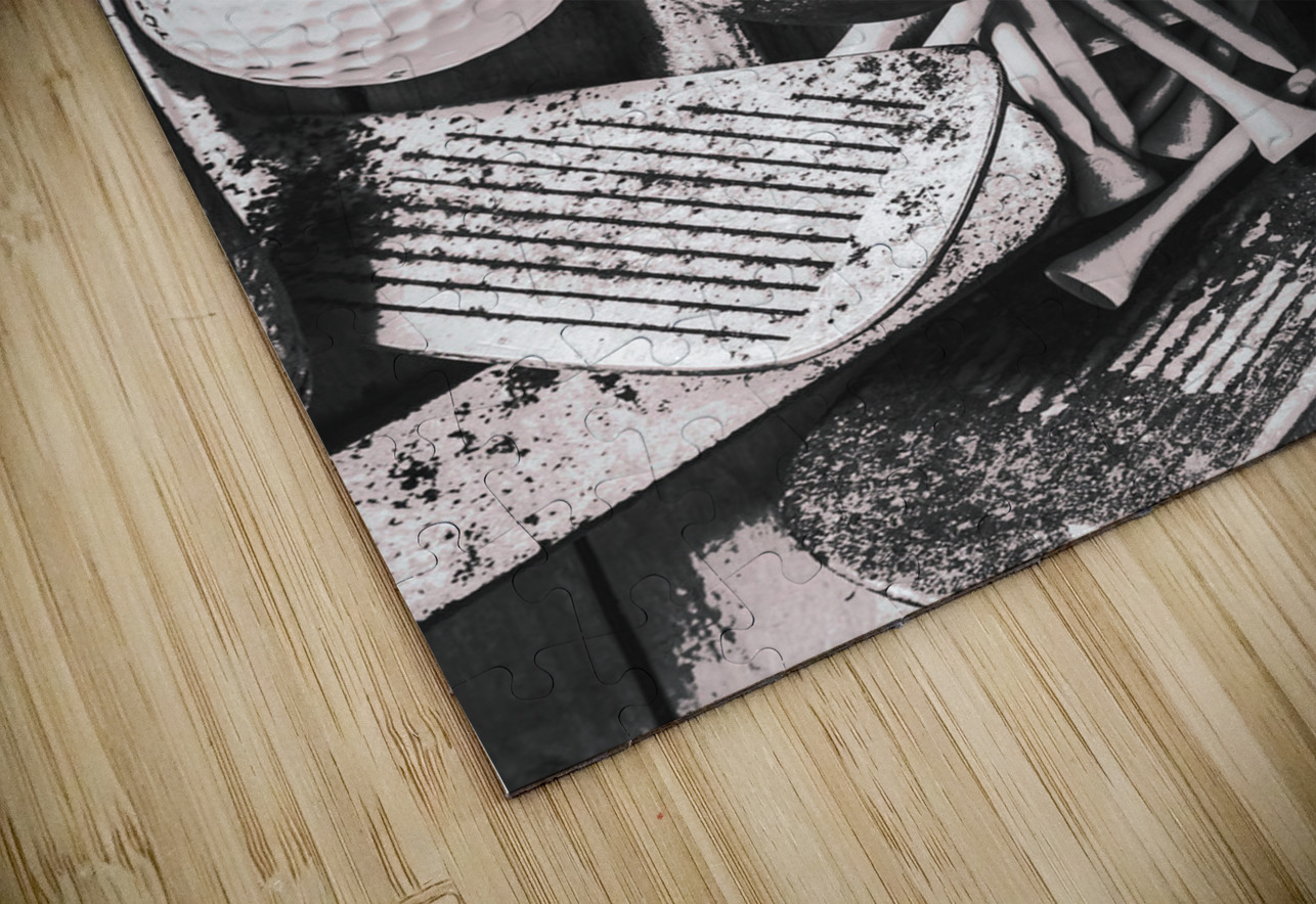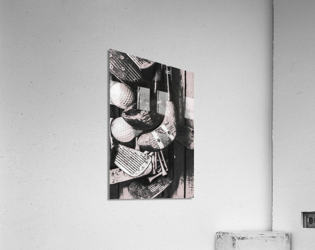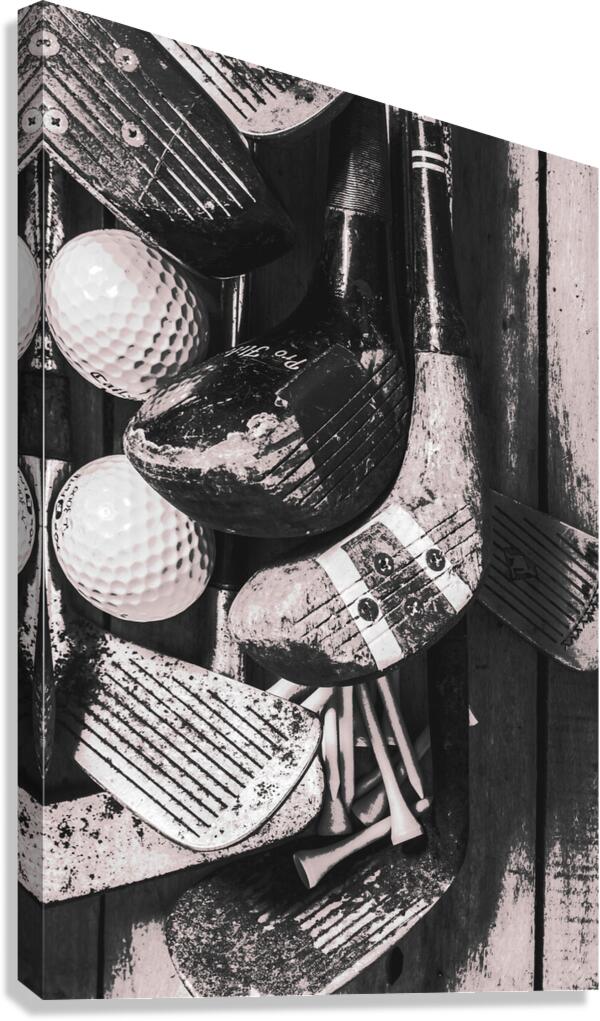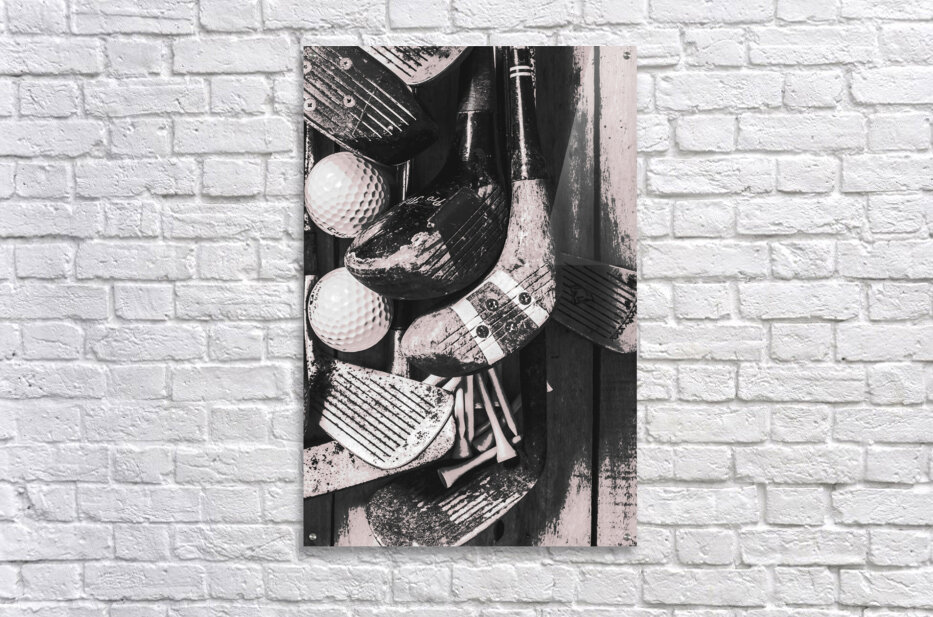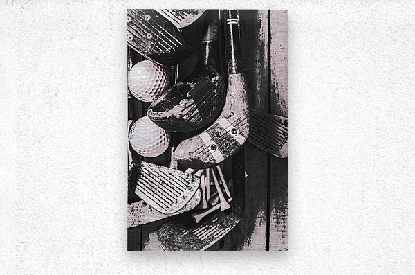 Old golfing artwork on a staged scene of old-fashioned play with time worn tees and golf clubs in rugged and aged styles