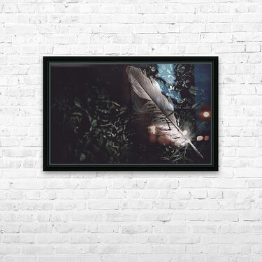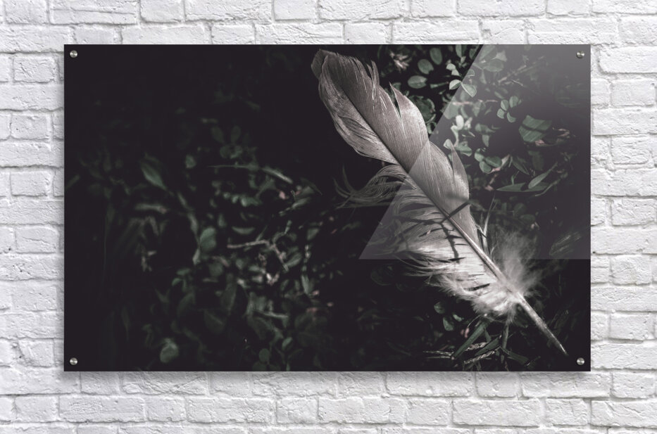 Feather quill lying in green grass. Writers guild  Frame print