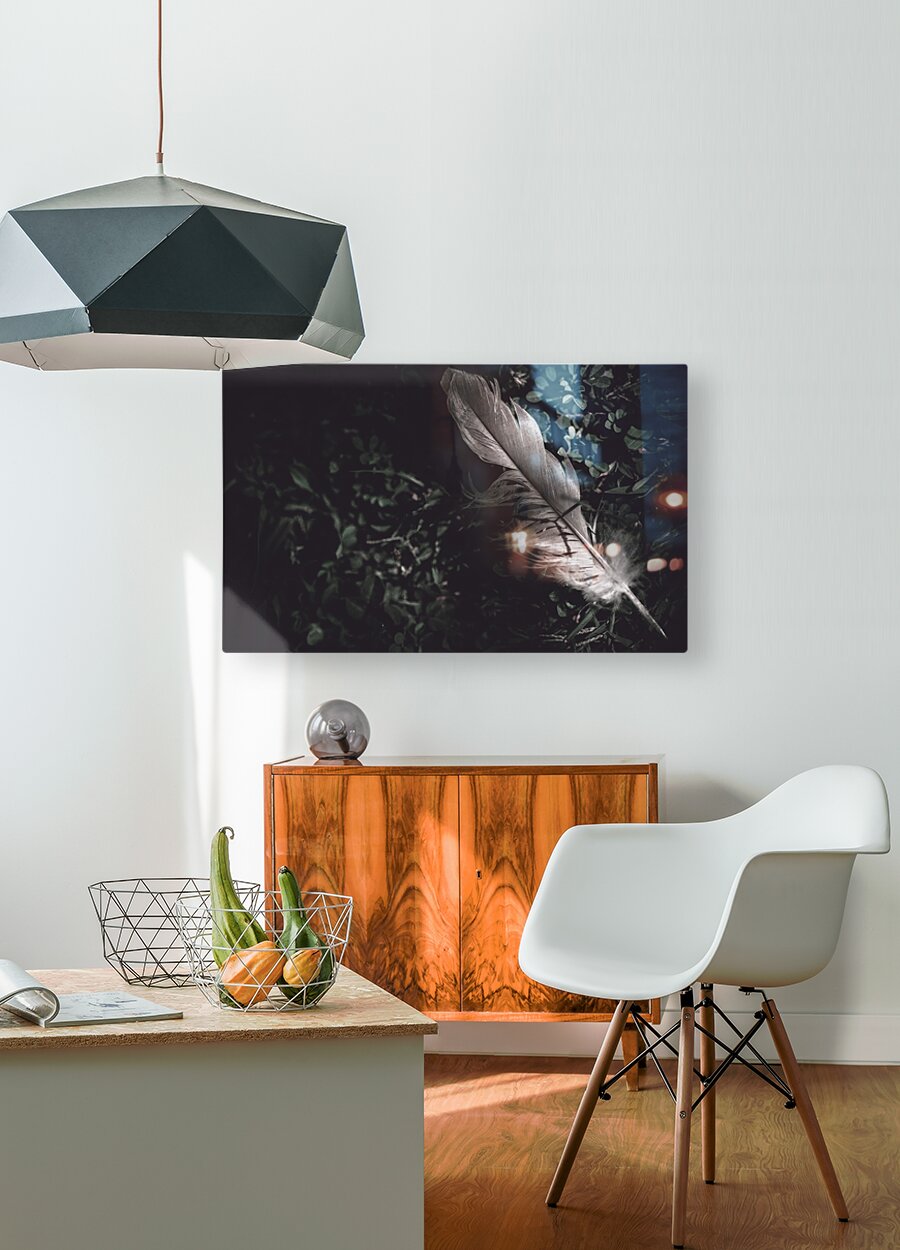 Soft elegant still life photo of a feather quill lying in green grass in a shadowy dark night field. Writers guild