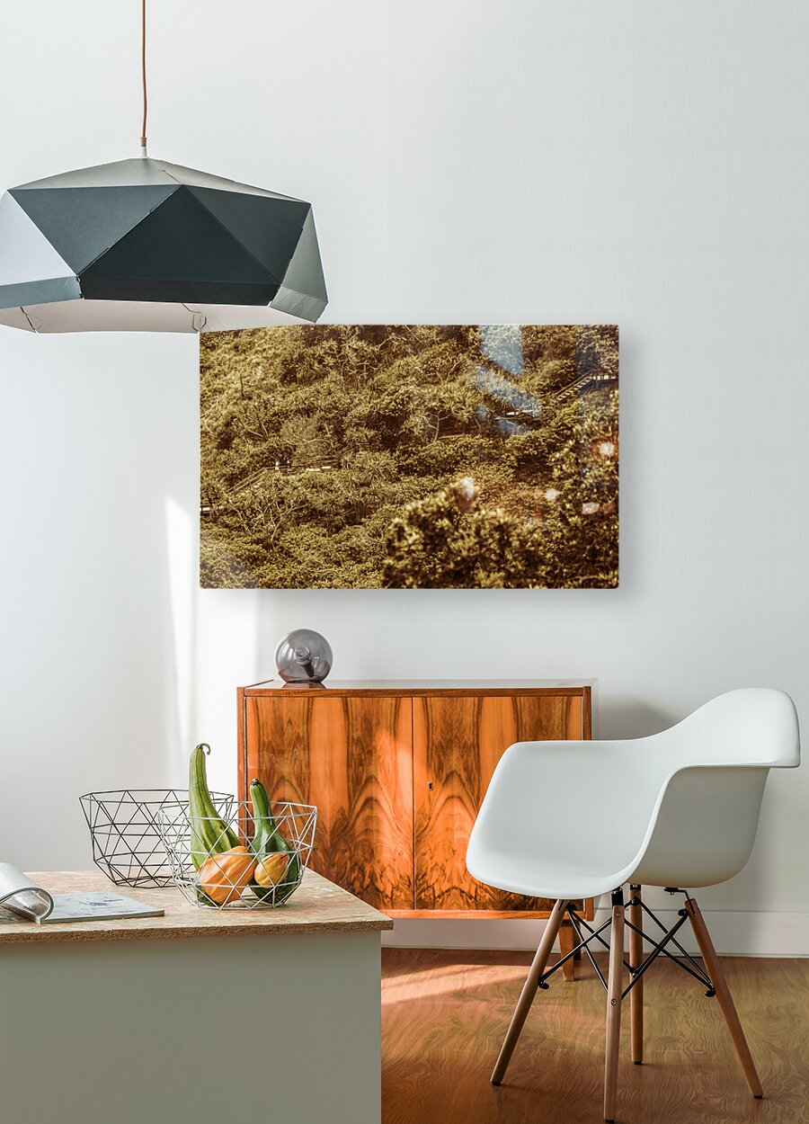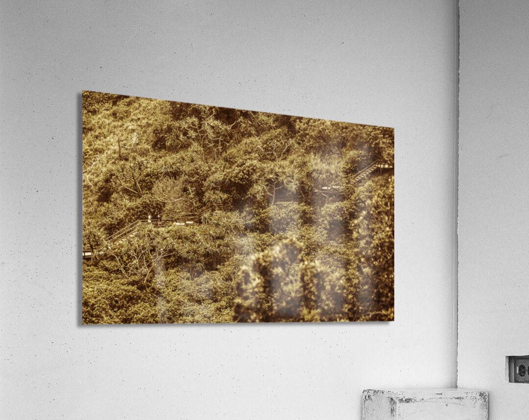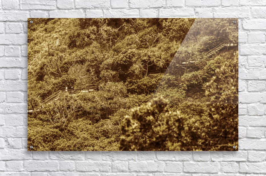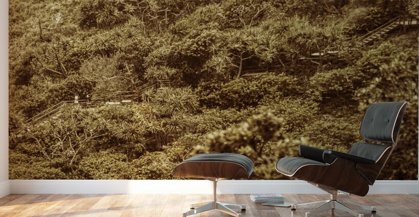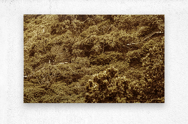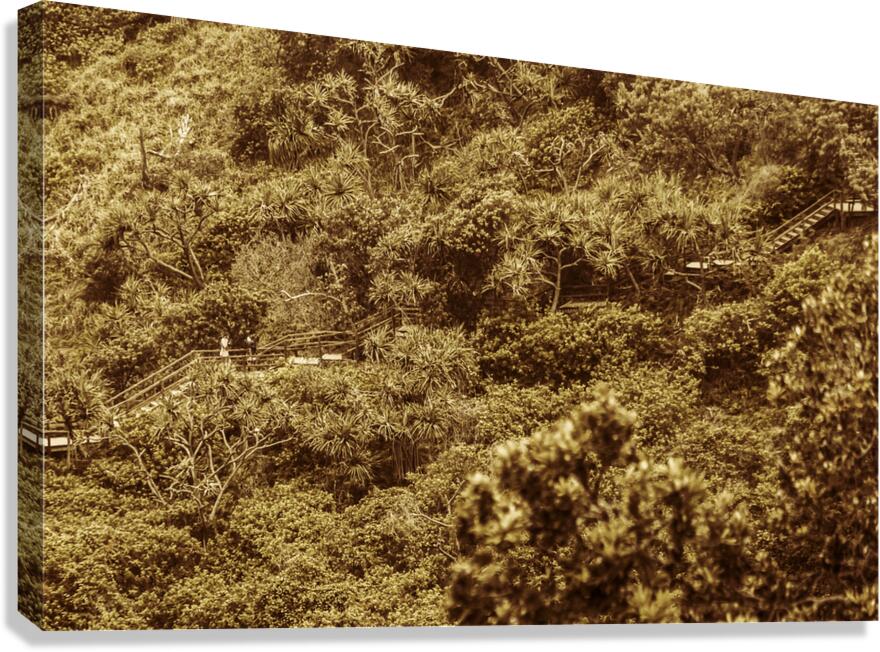 Muted landscape art on a stairwell leading through tropical island trees to higher elevations. Photographed: Frenchmans Beach Point Lookout North Stradbroke Island Queensland Australia
