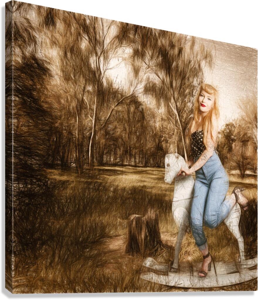 Vintage digital illustration of cute pin up girl riding old toy wooden horse in old line sketch forest. Rocking horse pin up