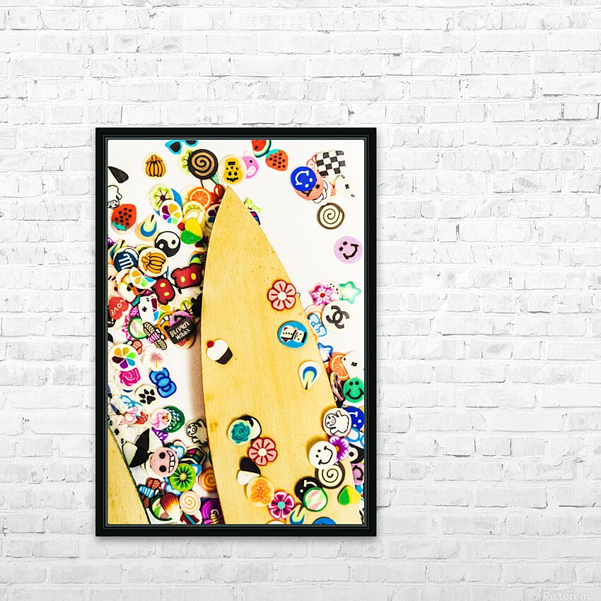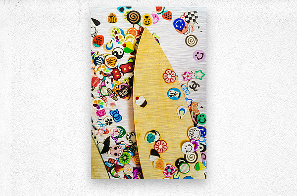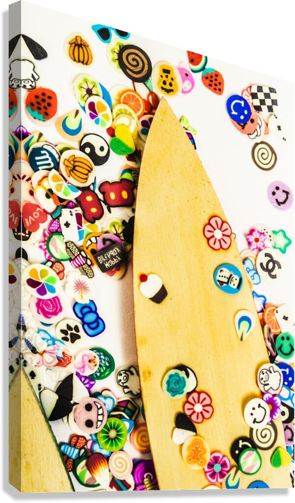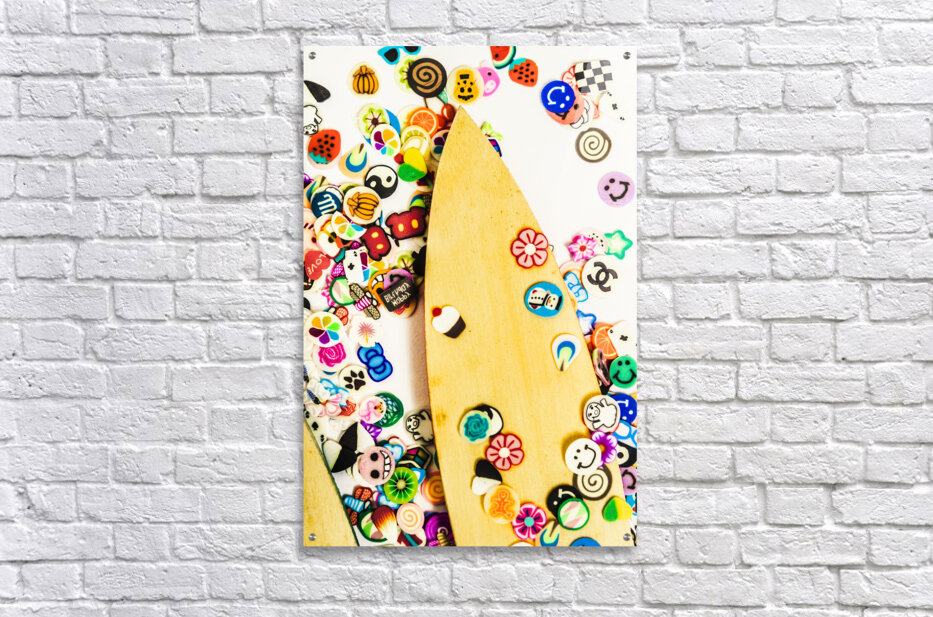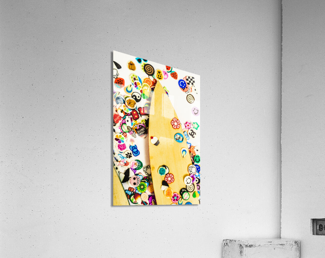 Colourful object art with carved surfboards and random surf decals. Stuck on boarding