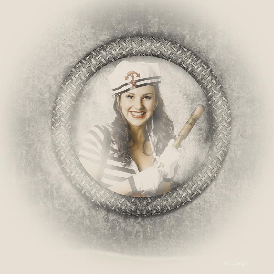 Attractive young boating pin-up woman smiling through maritime porthole holding brass telescope when on a seaside expedition adventure. Nautical shipp...[+]