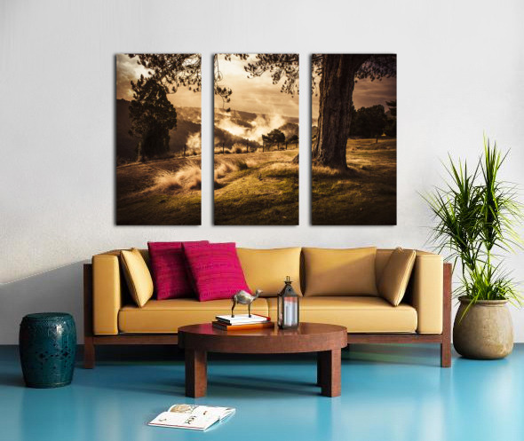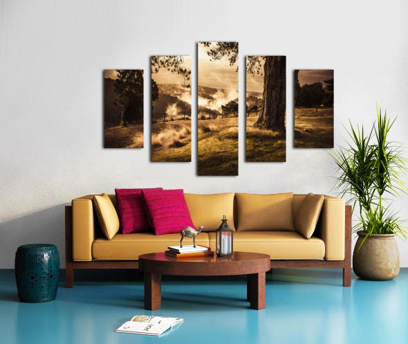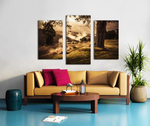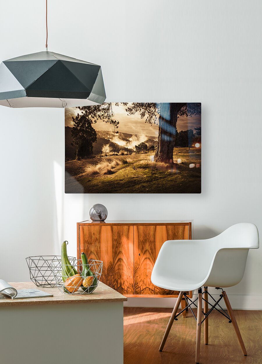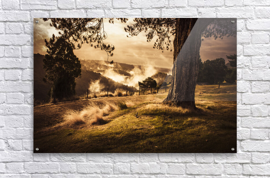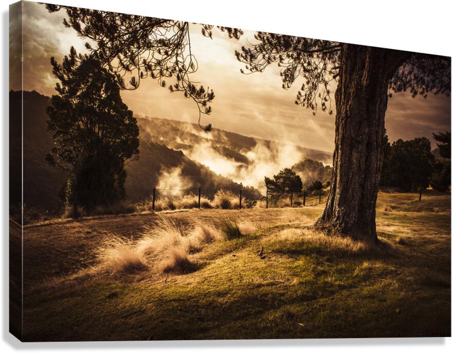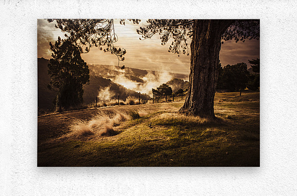 Peaceful vintage landscape photo of a yellow rural meadow at sun rise with foggy distant mountains. Australian countryside taken Waratah Tasmania