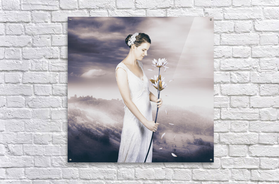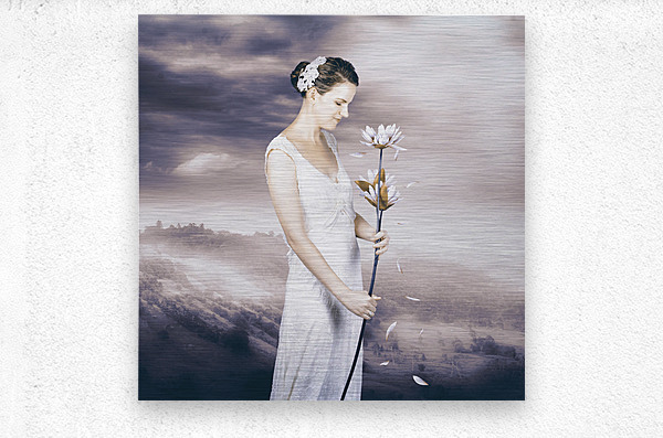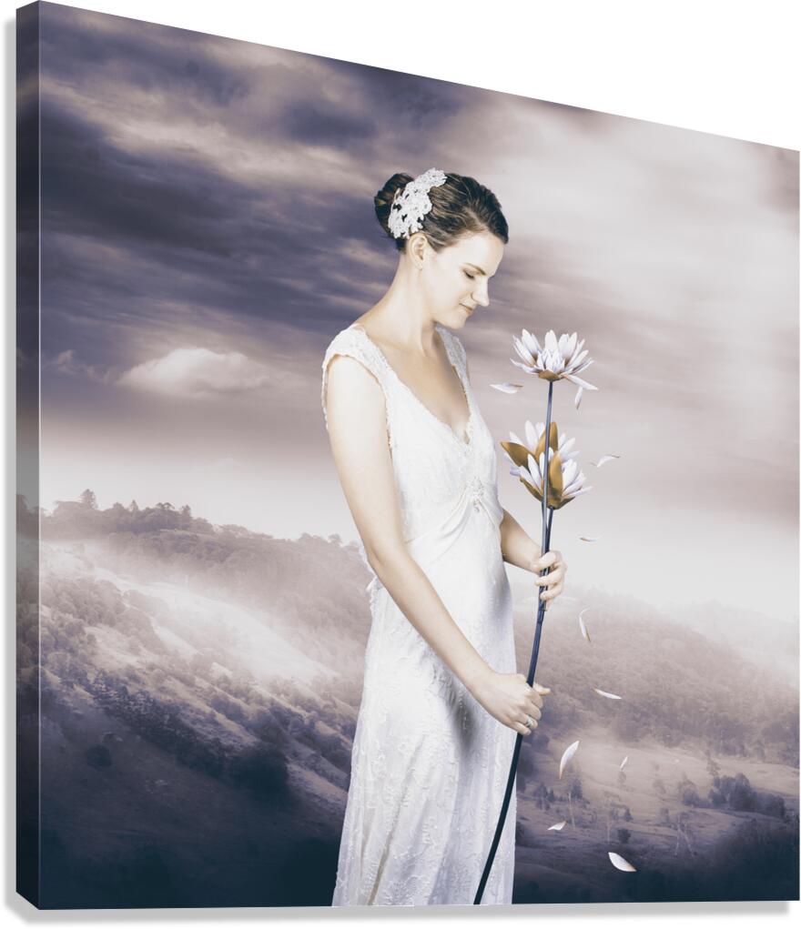 Sentimental woman on mountain lookout wearing vintage wedding gown holding flower with falling petals