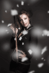 Creative retro photograph of a beautiful vintage girl dancing amongst raining white flower petals. Classic theatre concept