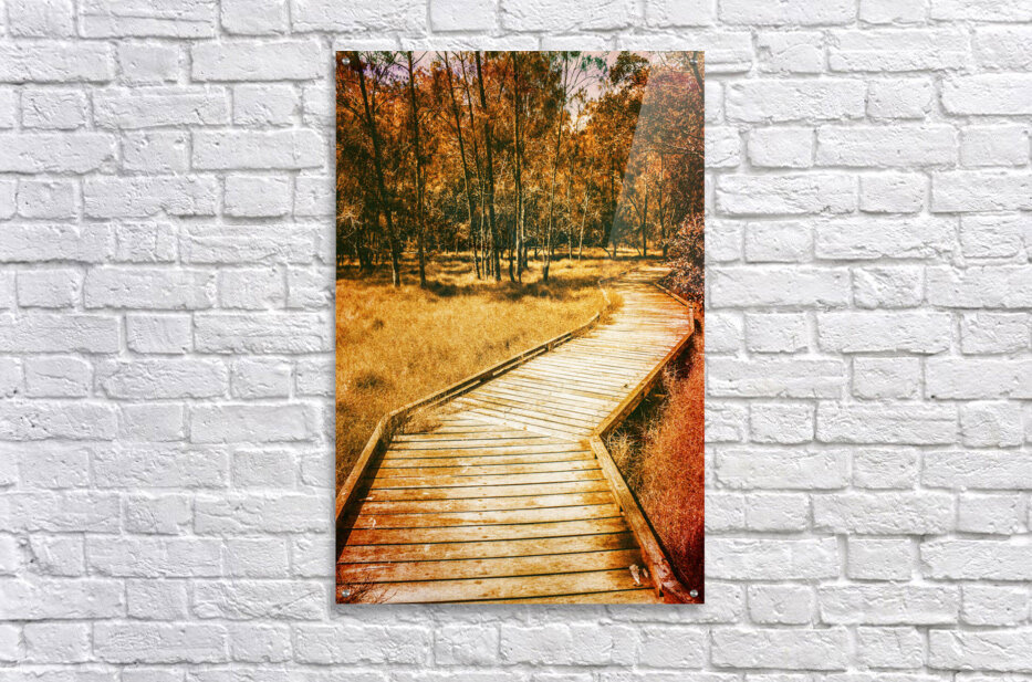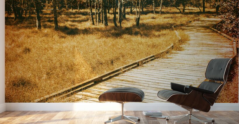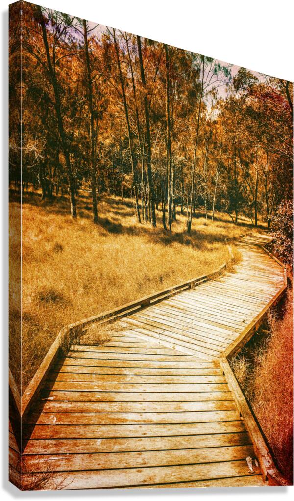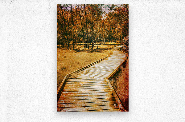 Vertical vintage landscape of an old wooden path leading through an autumn swampland. Taken Murrumba Downs Queensland Australia