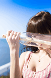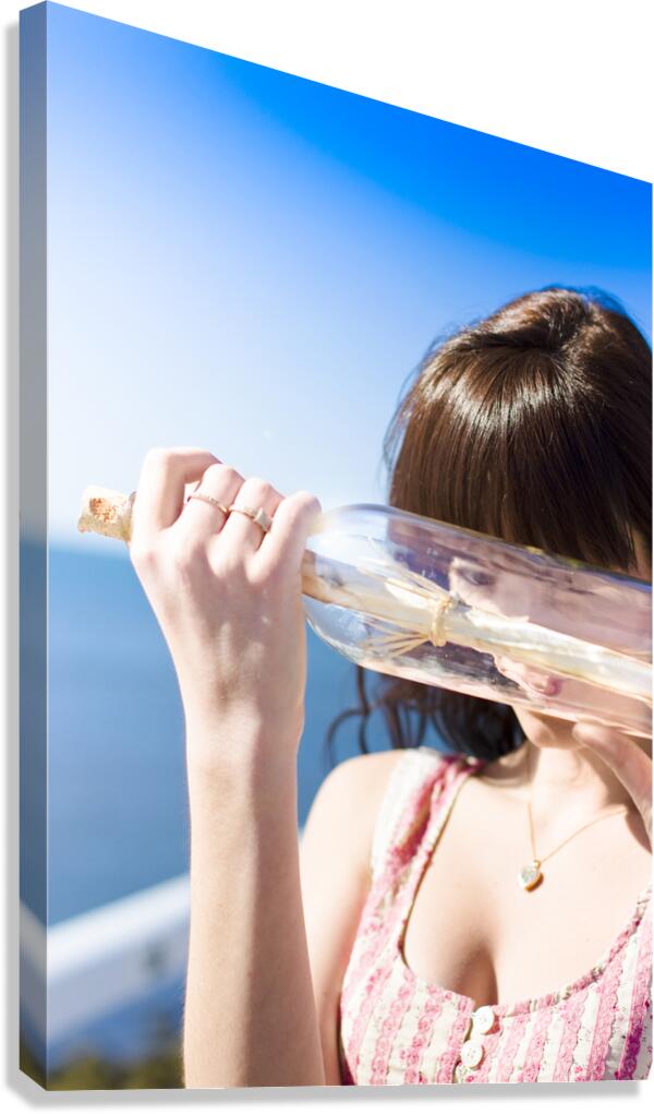 A Woman Stares Through The Glass Of A Message In A Bottle Found Washed Up By The Ocean Tide