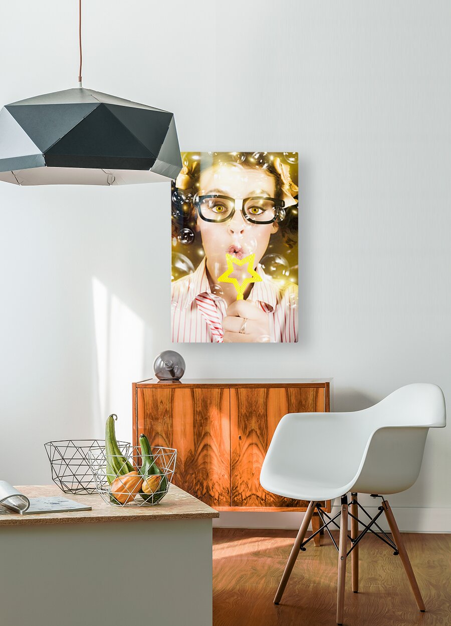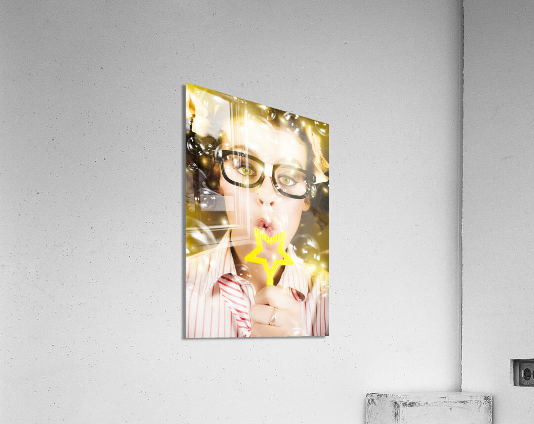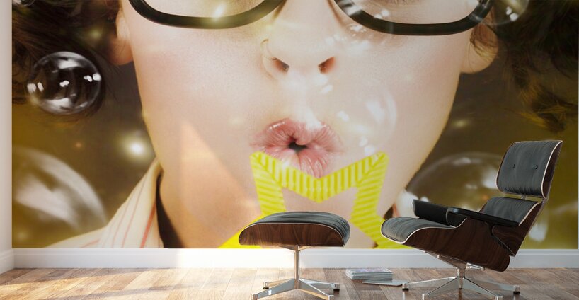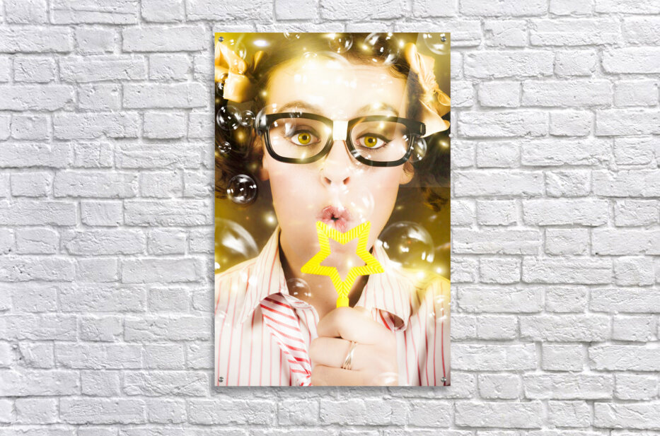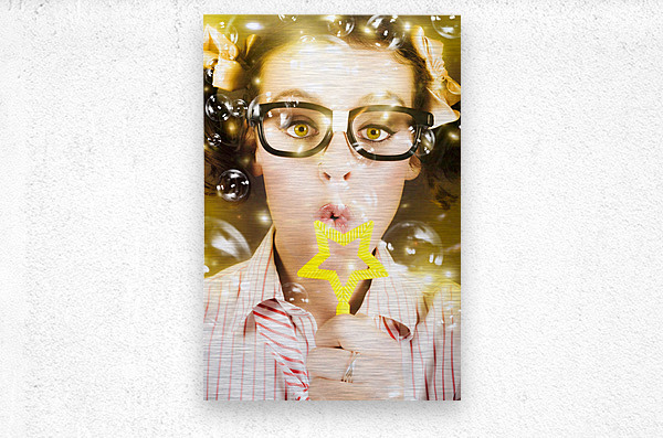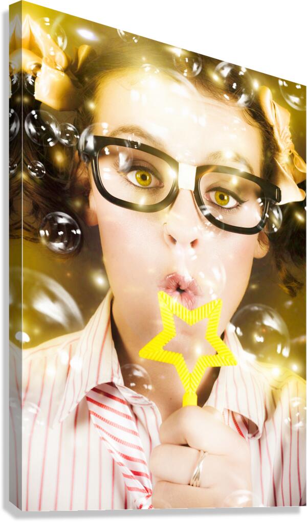 Fine Art Photo On The Face Of A Beautiful Female Geek Blowing Soap Bubble During A Birthday Party Celebration